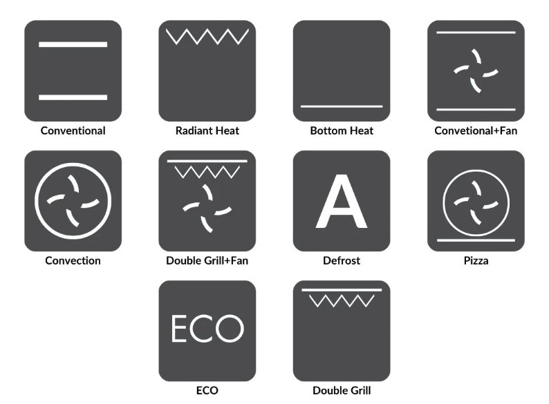 4. Гриль (зигзагообразная или пунктирная линия сверху). Технически гриль — это усиленный верхний нагревательный элемент, способный разогреваться до более высоких температур. Излучение в этом режиме имеет высокую интенсивность. Если зигзаг дополнен вентилятором, это режим турбо-гриля, позволяющий запекать крупные куски мяса, имитируя приготовление на вертеле.