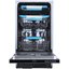 Полностью встроенная модель Кертинг KDI45575 предназначена для установки в кухонную мебель — шкаф, тумбу, нишу. Высота устройства составляет 81,5 см, но благодаря регулируемым ножкам ее можно увеличить до 87,5 см. Ширина 44,8 см и глубина 55 см — стандартные значения для узких посудомоек, так что встраивание не составит труда. Размеры ниши, куда будет установлен прибор, составляют 45 на 58 см. На дверцу навешивается декоративный фасад с жестким креплением в соответствии с общим стилем помещения. На торце двери находится закрытая электронная панель управления серебристого цвета с крупными кнопками и дисплеем белого цвета Cold White.