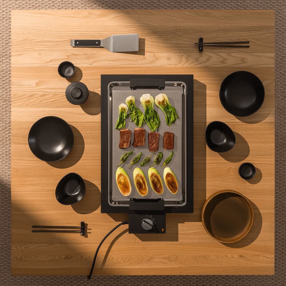 Благодаря продуманной конструкции гриль-теппан можно использовать как для приготовления повседневных блюд, так и для тематических ужинов, во время которых гости могут наблюдать за процессом приготовления или даже участвовать в нём. Устройство быстро нагревается и равномерно распределяет тепло, позволяя контролировать степень прожарки. После использования поверхность легко очищается, а низкий профиль корпуса упрощает хранение.