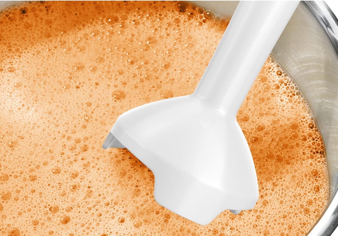 Погружной — мотор расположен в рукоятке, на конце которой есть насадка с венчиком или ножами. Вы опускаете ее в емкость и измельчаете продукты, удерживая прибор на месте, нажимая или проводя по кругу.