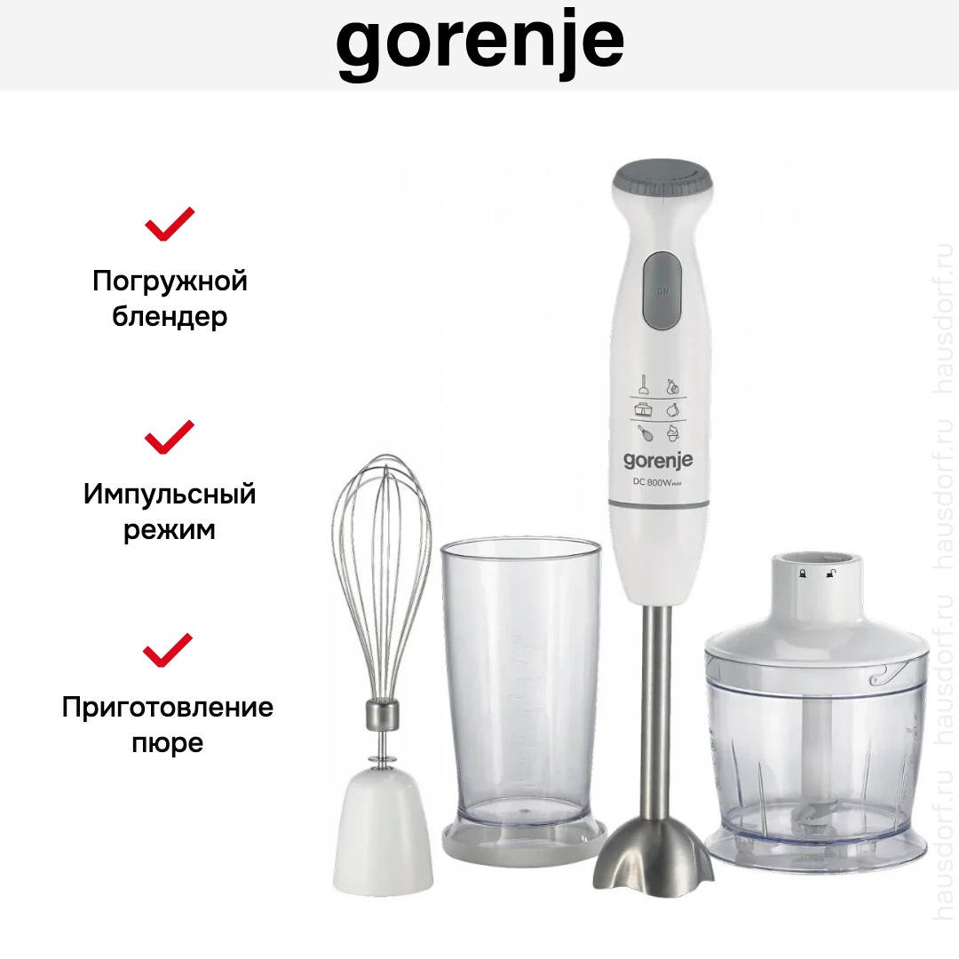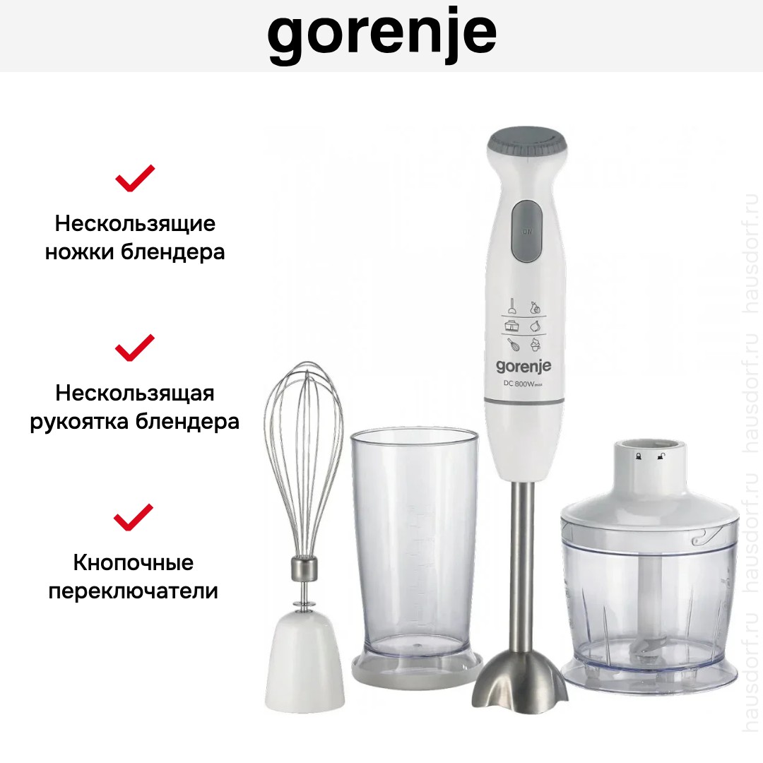 Погружной блендер Gorenje позволяет готовить смузи, коктейли, смешивать соусы и заправки и многое другое. Такая конструкция требует вашего участия — нужно держать рукоятку с насадкой и контролировать направление движения. Плюс в том, что можно использовать ее прямо в кастрюле, когда готовите, например, суп-пюре. Корпус сделан в основном из пластика, что уменьшает вес прибора. Он может как влиться в общую гамму интерьера, так и стать ярким акцентом; доминирующий цвет — белый. Благодаря специальным нескользящим ножкам блендер сохраняет устойчивость даже на высоких оборотах.