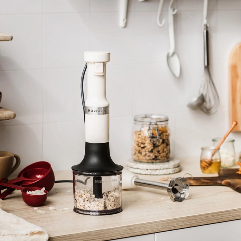 Погружной блендер KitchenAid позволяет готовить смузи, коктейли, смешивать соусы и заправки и многое другое. Такая конструкция требует вашего участия — нужно держать рукоятку с насадкой и контролировать направление движения. Плюс в том, что можно использовать ее прямо в кастрюле, когда готовите, например, суп-пюре. Корпус сделан в основном из пластика, что уменьшает вес прибора. Он может как влиться в общую гамму интерьера, так и стать ярким акцентом; доминирующий цвет — бежевый.
