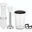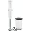 Прибор выполнен в чистом белом цвете, что придаёт ему лаконичный и универсальный внешний вид, легко вписывающийся в любой кухонный интерьер. Корпус изготовлен из прочного пластика, устойчивого к повреждениям и простого в уходе, а погружная часть — из гигиеничной нержавеющей стали, не подверженной коррозии и сохраняющей остроту лезвий даже при интенсивном использовании. В комплект входит мерный стакан объёмом 0,7 литра из качественного пластика, который одновременно служит ёмкостью для измельчения и удобной тарой для дозирования компонентов.