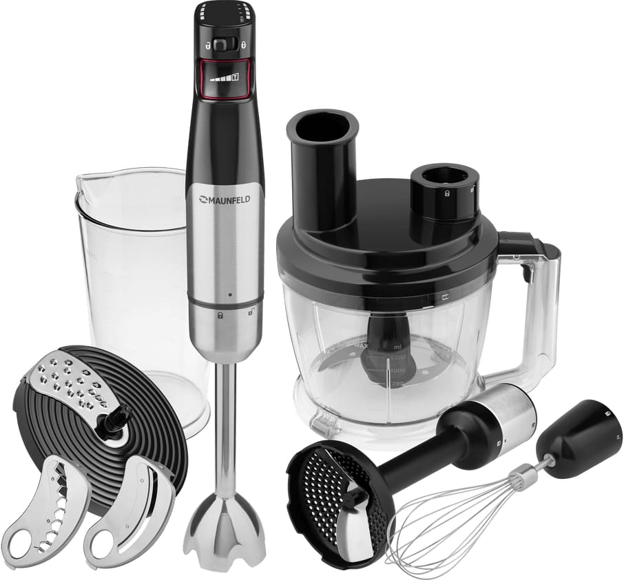 Блендер Maunfeld MF-123SB PRO — мощный и многофункциональный погружной прибор, созданный для тех, кто ценит скорость, точность и безупречный результат в приготовлении разнообразных блюд. С энергопотреблением в 1000 Вт он легко справляется с самыми плотными ингредиентами: от замороженных ягод и овощей до орехов и мяса, превращая их в однородную массу за считанные секунды.