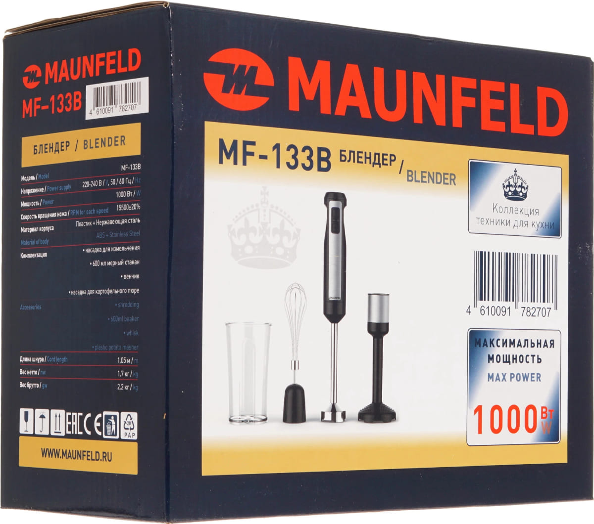 Погружной блендер Maunfeld MF-133B сочетает мощность и компактность для повседневных задач. Его строгий чёрный корпус выполнен из лёгкого пластика, который снижает общий вес прибора и делает его удобным при длительном использовании. Благодаря своим габаритам и минималистичному дизайну техника не займет много места на полке, что удобно при хранении.