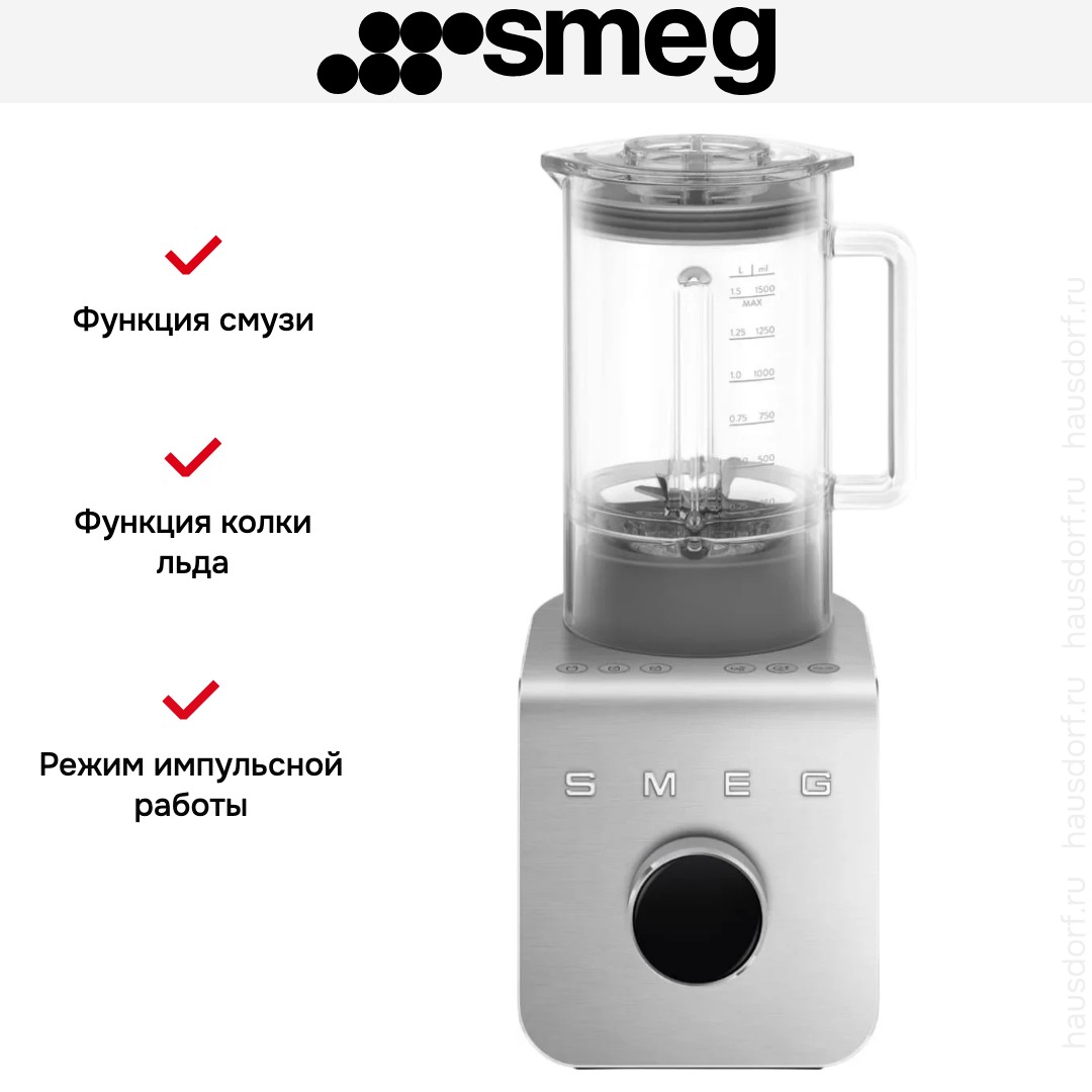 Стационарный блендер Smeg позволяет готовить смузи, коктейли, смешивать соусы и заправки, измельчать продукты до состояния пюре и многое другое. Его конструкция подразумевает автономную работу — вам нужно только положить овощи или фрукты и выбрать режим. Корпус сделан в основном из пластика, что уменьшает вес прибора. Он может как влиться в общую гамму интерьера, так и стать ярким акцентом; доминирующий цвет — черный. Благодаря специальным нескользящим ножкам блендер сохраняет устойчивость даже на высоких оборотах.