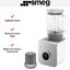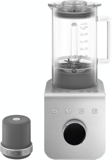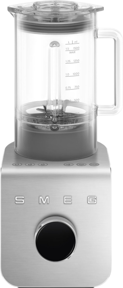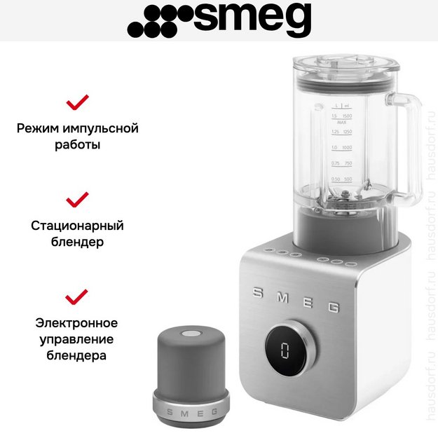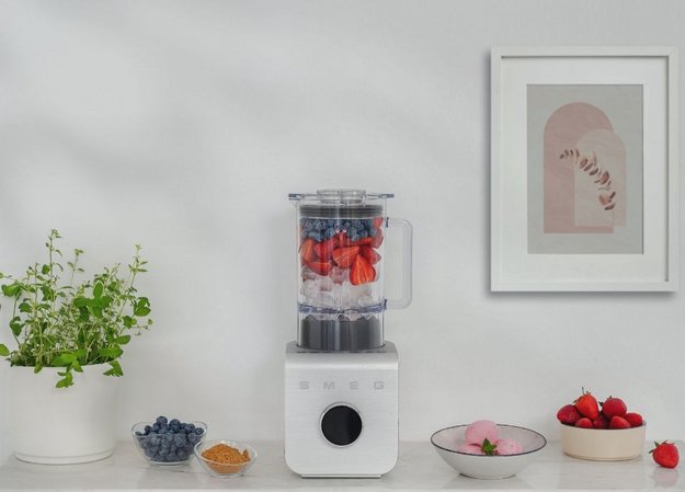 Стационарный блендер Smeg позволяет готовить смузи, коктейли, смешивать соусы и заправки, измельчать продукты до состояния пюре и многое другое. Его конструкция подразумевает автономную работу — вам нужно только положить овощи или фрукты и выбрать режим. Корпус сделан в основном из пластика, что уменьшает вес прибора. Он может как влиться в общую гамму интерьера, так и стать ярким акцентом; доминирующий цвет — белый. Благодаря специальным нескользящим ножкам блендер сохраняет устойчивость даже на высоких оборотах.