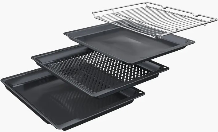 В стандартную комплектацию любого духового шкафа входят один или два противня — эмалированных или с антипригарным покрытием — и решетка. Единственный противень, как правило, имеет низкие бортики и предназначается для приготовления выпечки. Если духовка комплектуется двумя противнями, то второй отличается более высокими бортиками — его можно использовать для запекания мяса, птицы, овощных блюд. На решетке в духовке, не оснащенной грилем, обычно устанавливаются формы для запекания — стальные, керамические или стеклянные. В духовках премиум-класса количество противней может быть увеличено: к стандартному комплекту добавляются противни с перфорацией для мяса, специальные поддоны для сбора выделившегося сока.