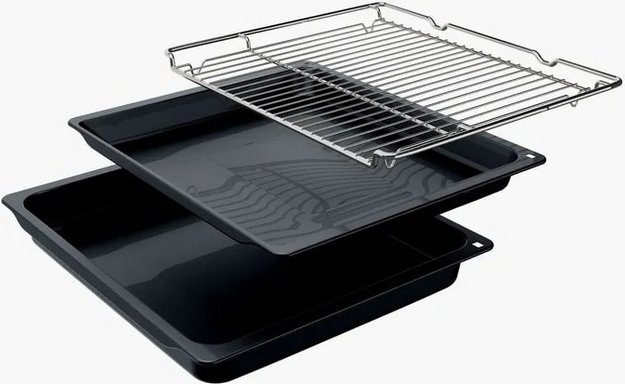 В стандартную комплектацию любого духового шкафа входят один или два противня — эмалированных или с антипригарным покрытием — и решетка. Единственный противень, как правило, имеет низкие бортики и предназначается для приготовления выпечки. Если духовка комплектуется двумя противнями, то второй отличается более высокими бортиками — его можно использовать для запекания мяса, птицы, овощных блюд. На решетке в духовке, не оснащенной грилем, обычно устанавливаются формы для запекания — стальные, керамические или стеклянные. В духовках премиум-класса количество противней может быть увеличено: к стандартному комплекту добавляются противни с перфорацией для мяса, специальные поддоны для сбора выделившегося сока.