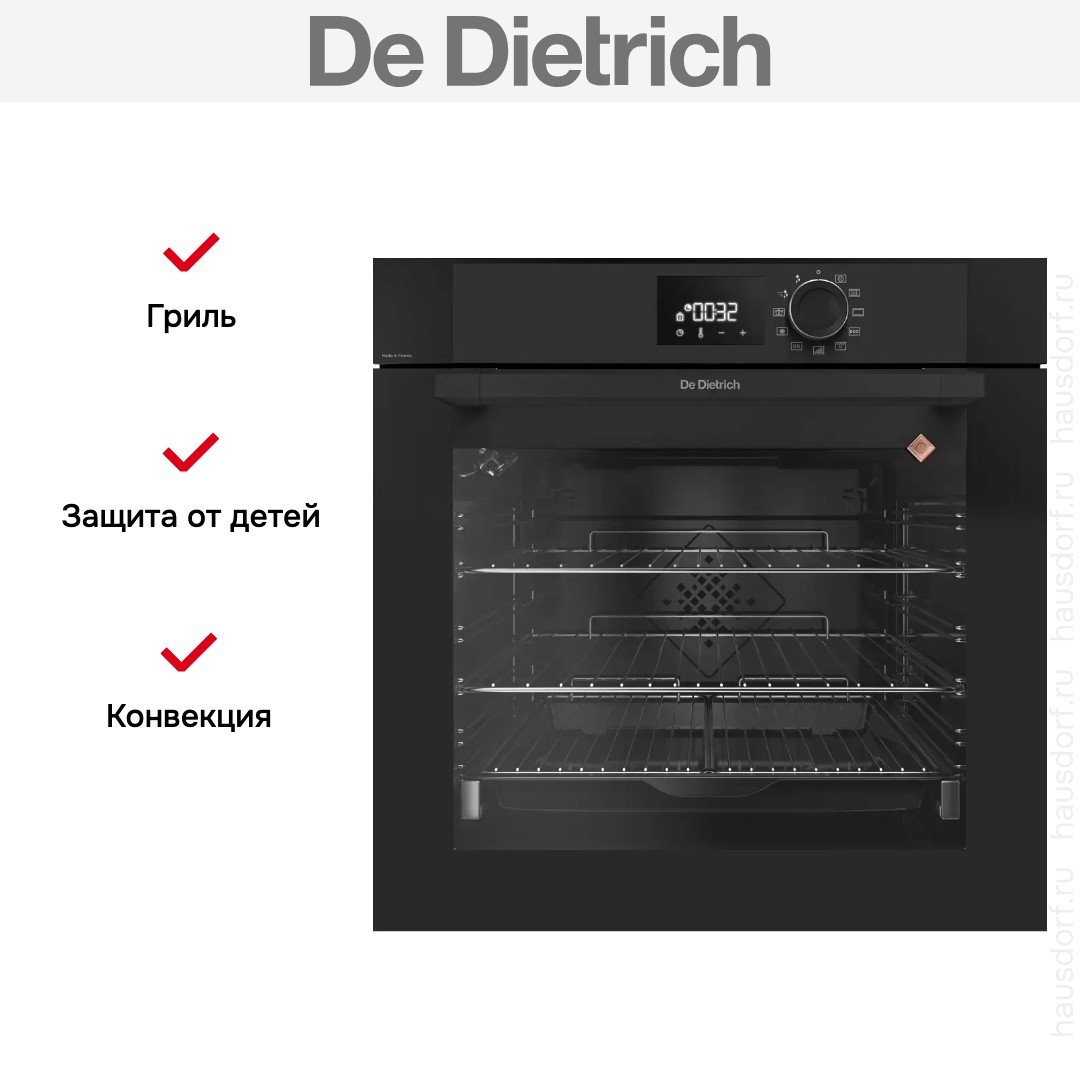 Количество режимов работы в духовом шкафу Де Дитрих: 9. В число доступных программ входят: конвекция, гриль для создания хрустящей корочки, и другие. Тип гриля в этой модели — электрический.