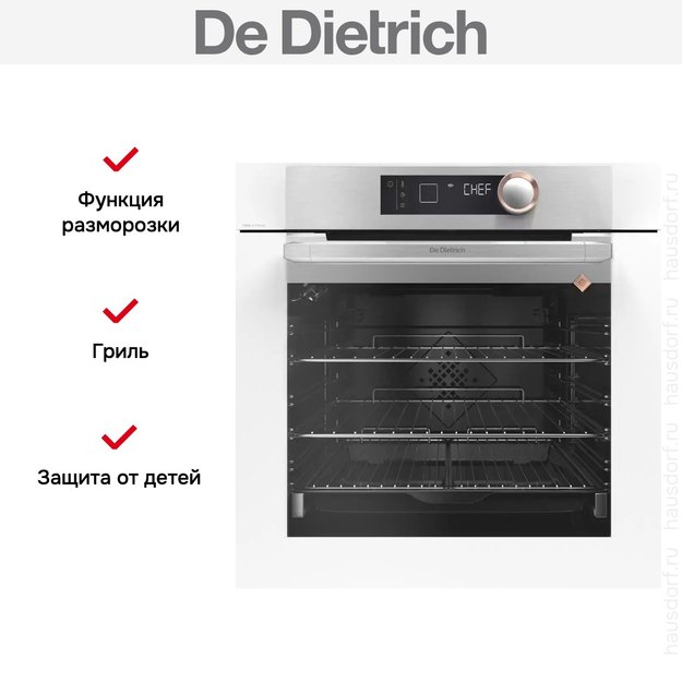 Количество режимов работы в духовом шкафу Де Дитрих: 10. В число доступных программ входят: конвекция, гриль для создания хрустящей корочки, и другие. Помимо основных программ воспользуйтесь специальными возможностями этого прибора: размораживанием продуктов, чтобы сократить время на подготовку; комбинацией нижнего и вентиляционного нагрева и другими. Тип гриля в этой модели — электрический.