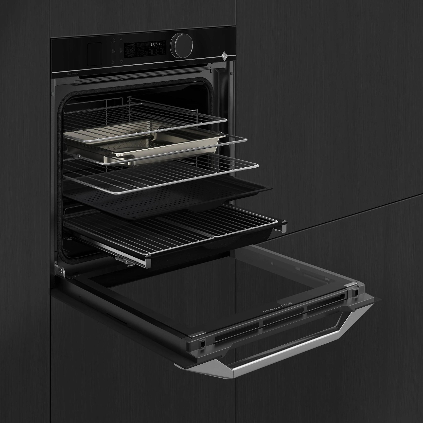 В стандартную комплектацию любого духового шкафа входят один или два противня — эмалированных или с антипригарным покрытием — и решетка. Единственный противень, как правило, имеет низкие бортики и предназначается для приготовления выпечки. Если духовка комплектуется двумя противнями, то второй отличается более высокими бортиками — его можно использовать для запекания мяса, птицы, овощных блюд. На решетке в духовке, не оснащенной грилем, обычно устанавливаются формы для запекания — стальные, керамические или стеклянные. В духовках премиум-класса количество противней может быть увеличено: к стандартному комплекту добавляются противни с перфорацией для мяса, специальные поддоны для сбора выделившегося сока.