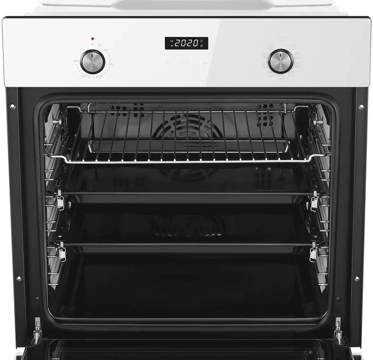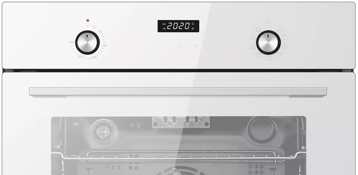 Особенности дизайна и внешней панели управления — также важный пункт при выборе духовки на кухню. В данной модели нужно обратить внимание на цвет — белый,