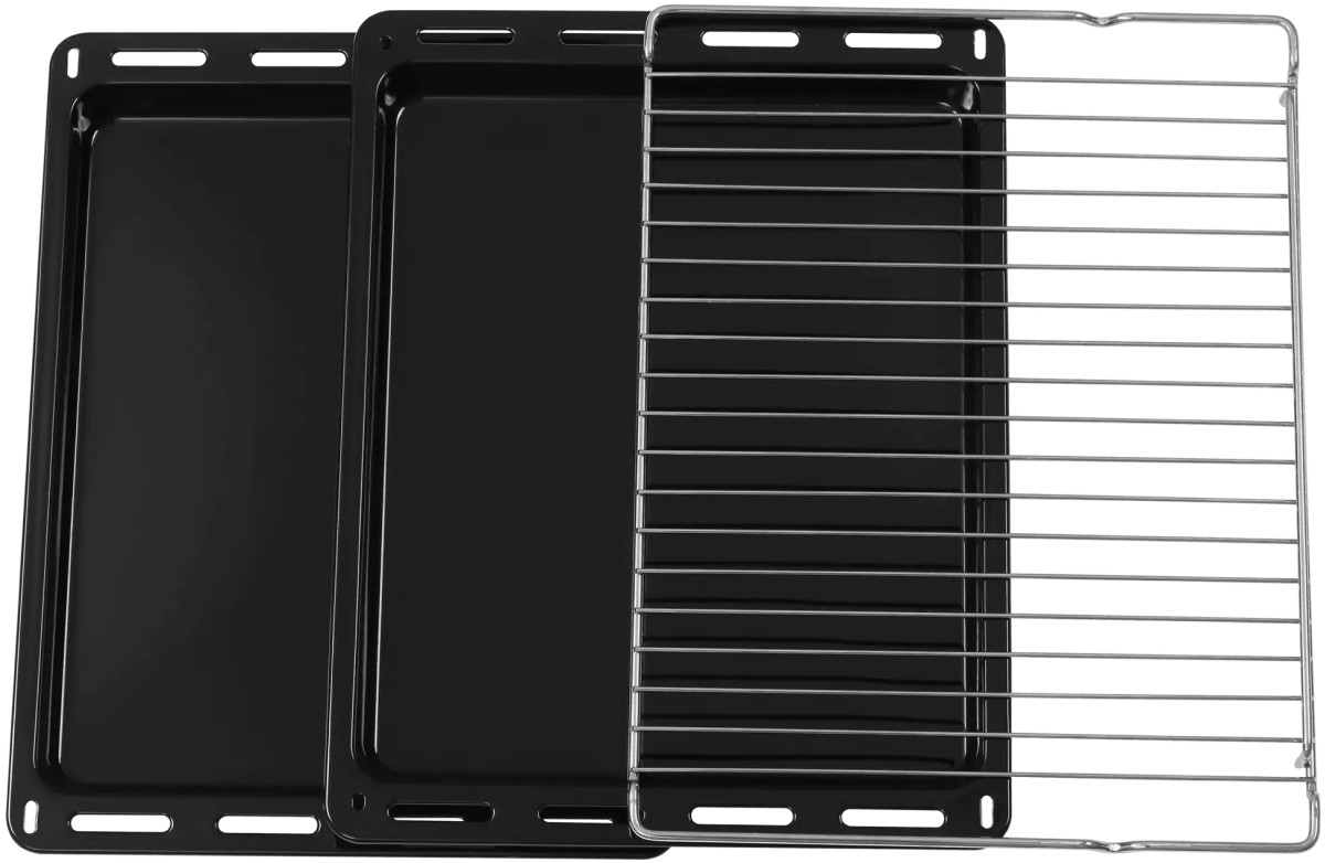 В стандартную комплектацию любого духового шкафа входят один или два противня — эмалированных или с антипригарным покрытием — и решетка. Единственный противень, как правило, имеет низкие бортики и предназначается для приготовления выпечки. Если духовка комплектуется двумя противнями, то второй отличается более высокими бортиками — его можно использовать для запекания мяса, птицы, овощных блюд. На решетке в духовке, не оснащенной грилем, обычно устанавливаются формы для запекания — стальные, керамические или стеклянные. В духовках премиум-класса количество противней может быть увеличено: к стандартному комплекту добавляются противни с перфорацией для мяса, специальные поддоны для сбора выделившегося сока.