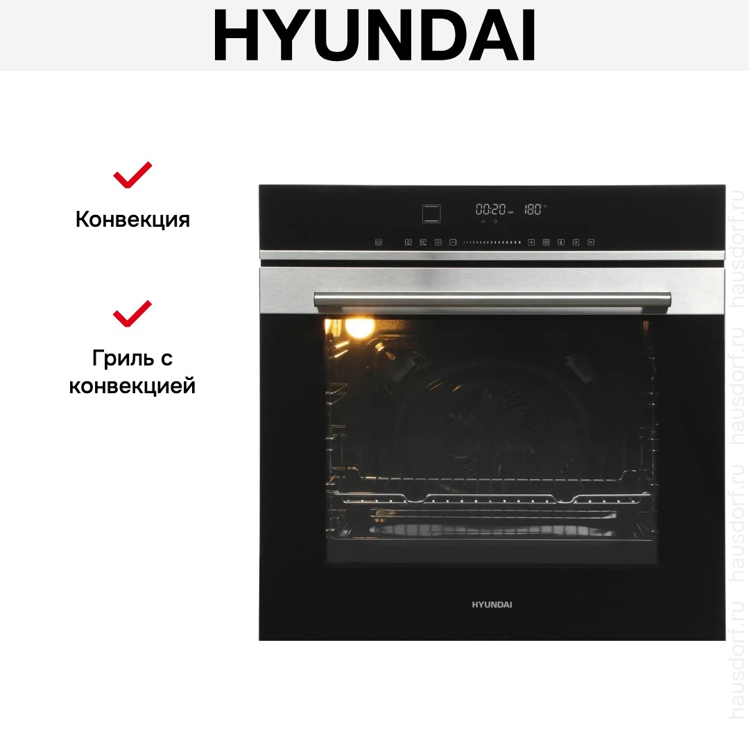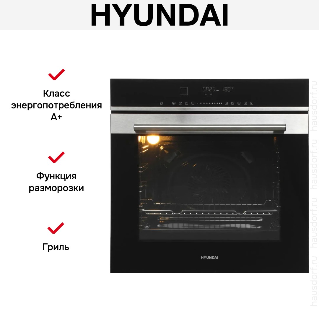 Количество режимов работы в духовом шкафу Хендай: 13. В число доступных программ входят: классический нагрев, верхний нагрев, нижний нагрев, конвекция, гриль для создания хрустящей корочки, и другие. Помимо основных программ воспользуйтесь специальными возможностями этого прибора: размораживанием продуктов, чтобы сократить время на подготовку; и другими. Тип гриля в этой модели — электрический.