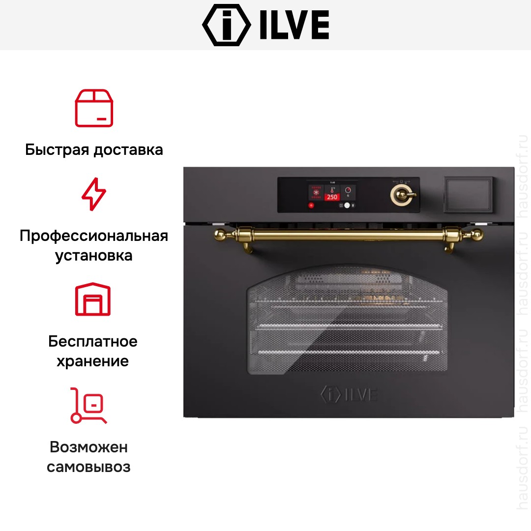 Количество режимов работы в духовом шкафу Илве: 10. В число доступных программ входят: конвекция, приготовление с помощью микроволн, дополнительное использование пара, гриль для создания хрустящей корочки, и другие. Тип гриля в этой модели — электрический.