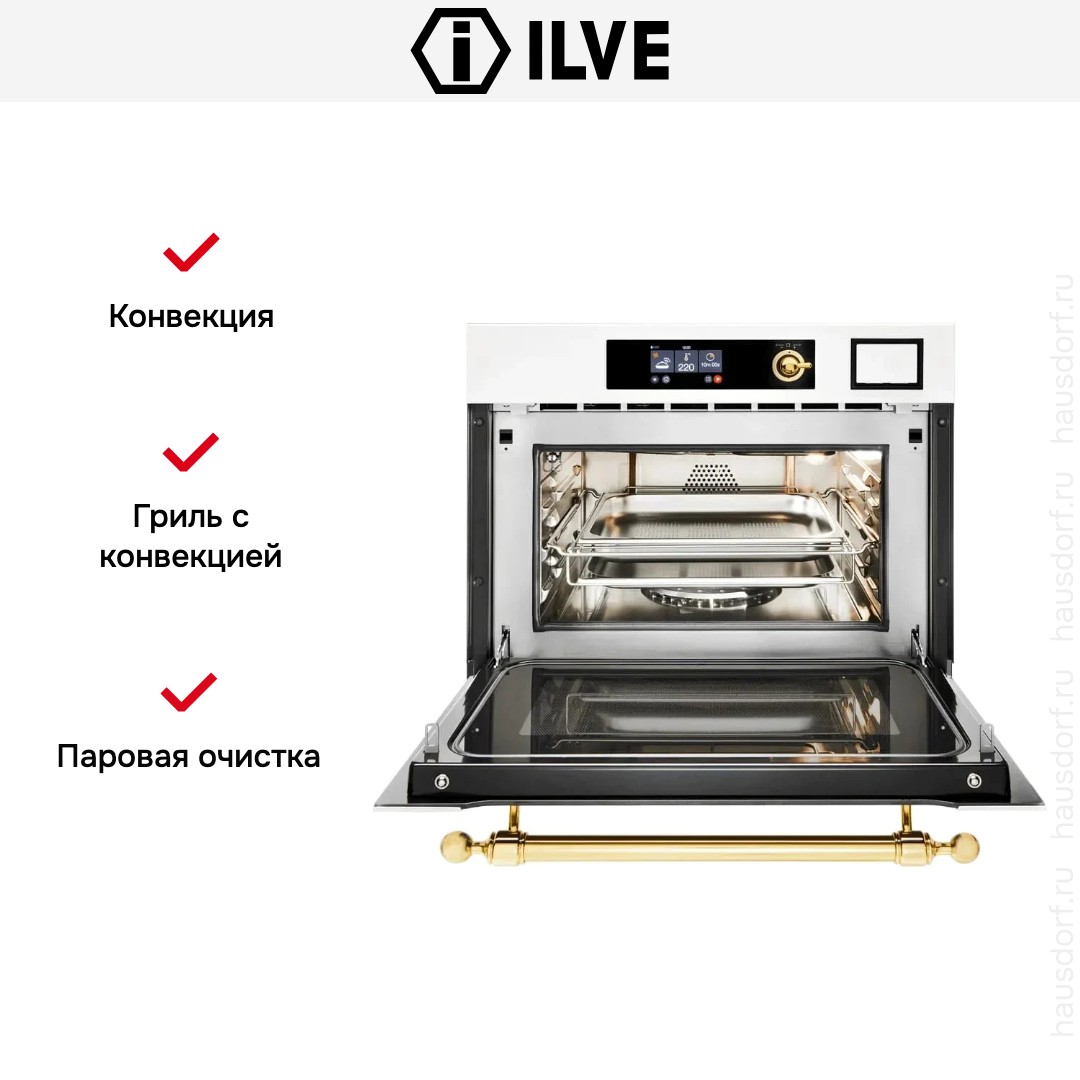 Количество режимов работы в духовом шкафу Илве: 10. В число доступных программ входят: конвекция, приготовление с помощью микроволн, дополнительное использование пара, гриль для создания хрустящей корочки, и другие. Тип гриля в этой модели — электрический.