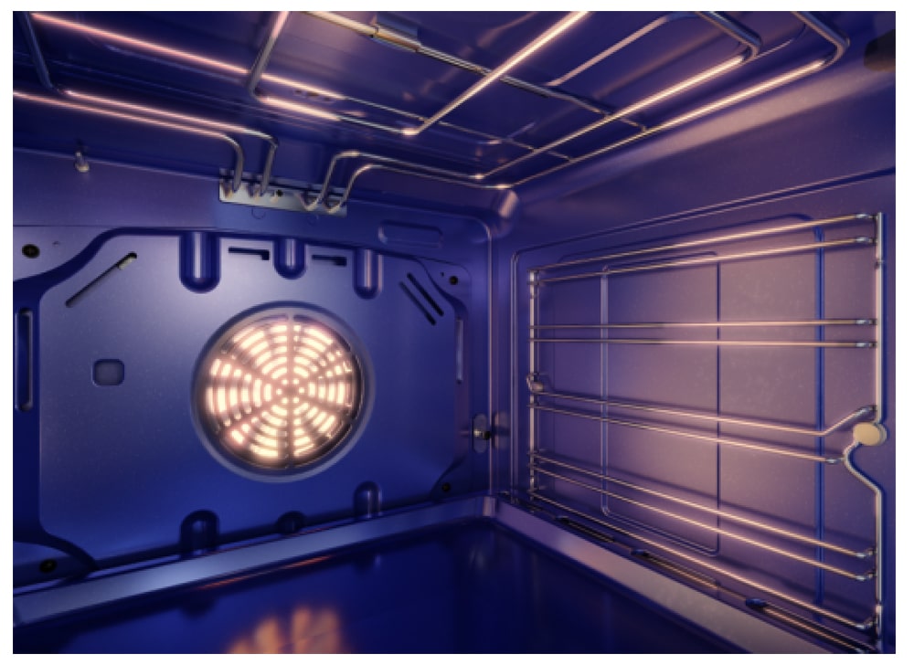 Большой гриль представляет собой трубчатый нагревательный элемент, который размещается на потолке камеры: он состоит из двух контуров, один внутри другого. При работе большого гриля включаются оба контура, так что инфракрасное излучение воздействует на продукты, размещенные на всей плоскости противня или решетки. Конвекционный вентилятор высокой мощности находится за задней стенкой духового шкафа, горячий воздух поступает в камеру через систему отверстий. Они расположены так, чтобы потоки горячего воздуха распространялись по всему объему камеры, попадая в самые дальние точки. Смешивание горячего и остывшего воздуха позволяет поддерживать одинаковую температуру на всех уровнях.