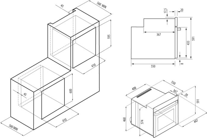 Для корректного встраивания требуется ниша размером 60×41×56 см, что обеспечивает плотную фиксацию, аккуратную интеграцию в кухонный гарнитур и необходимую циркуляцию воздуха вокруг корпуса. Небольшой технологический зазор между стенками проёма и корпусом способствует эффективному теплоотводу и продлевает срок службы устройства.