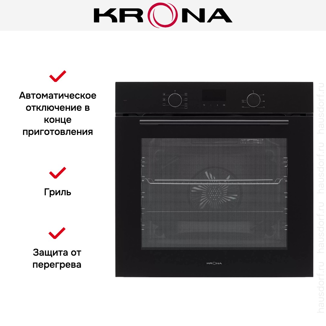 Количество режимов работы в духовом шкафу Крона: 6. В число доступных программ входят: конвекция, гриль для создания хрустящей корочки, и другие. Тип гриля в этой модели — электрический.