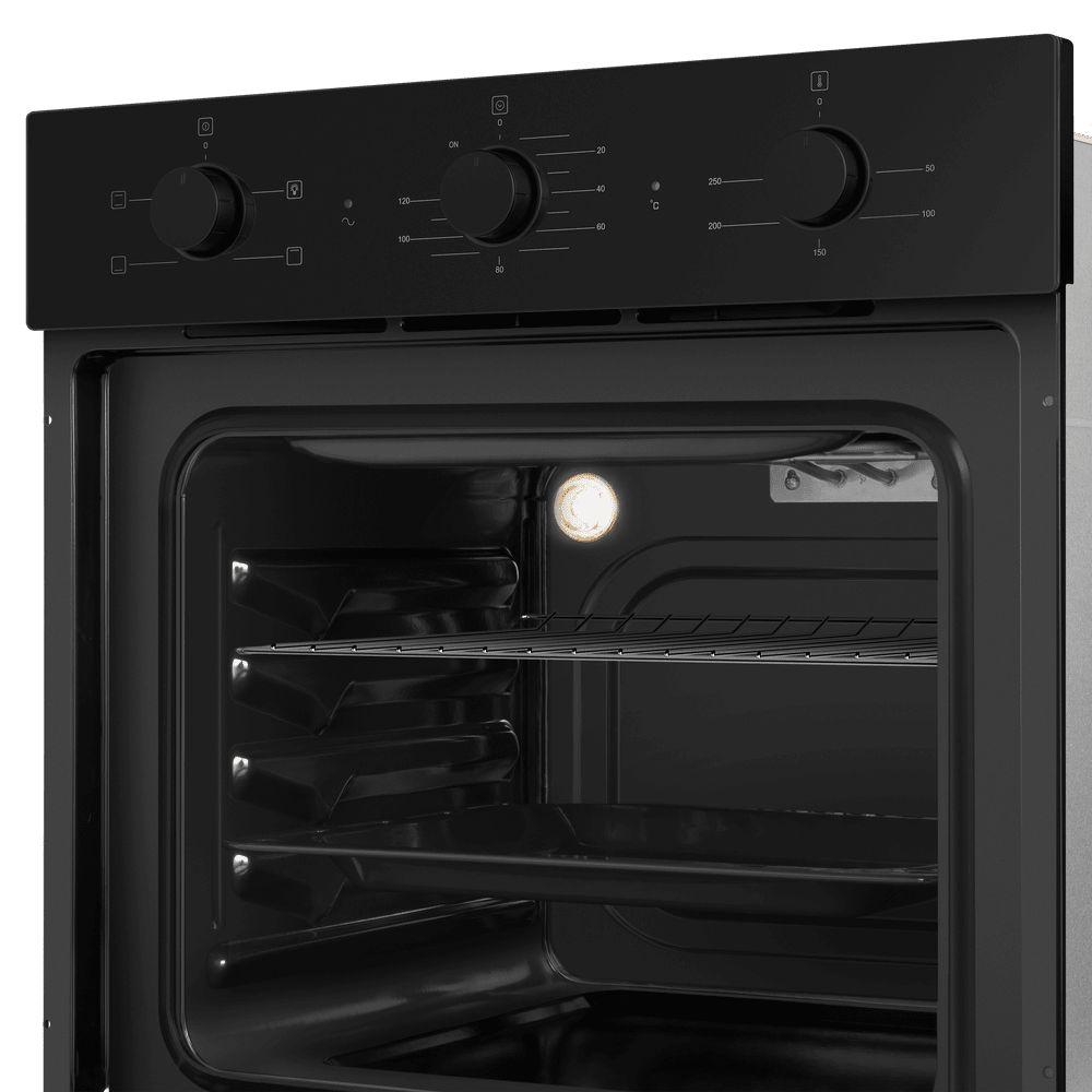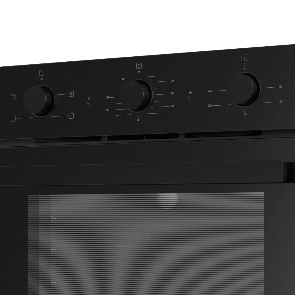 Особенности дизайна и внешней панели управления — также важный пункт при выборе духовки на кухню. В данной модели нужно обратить внимание на цвет — черный, Механическая панель управления позволяет быстро разобраться в настройке программ и не требует чрезмерных усилий.
