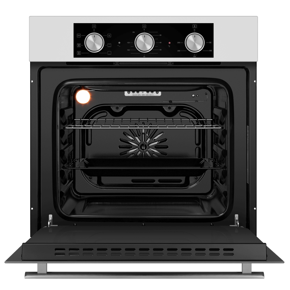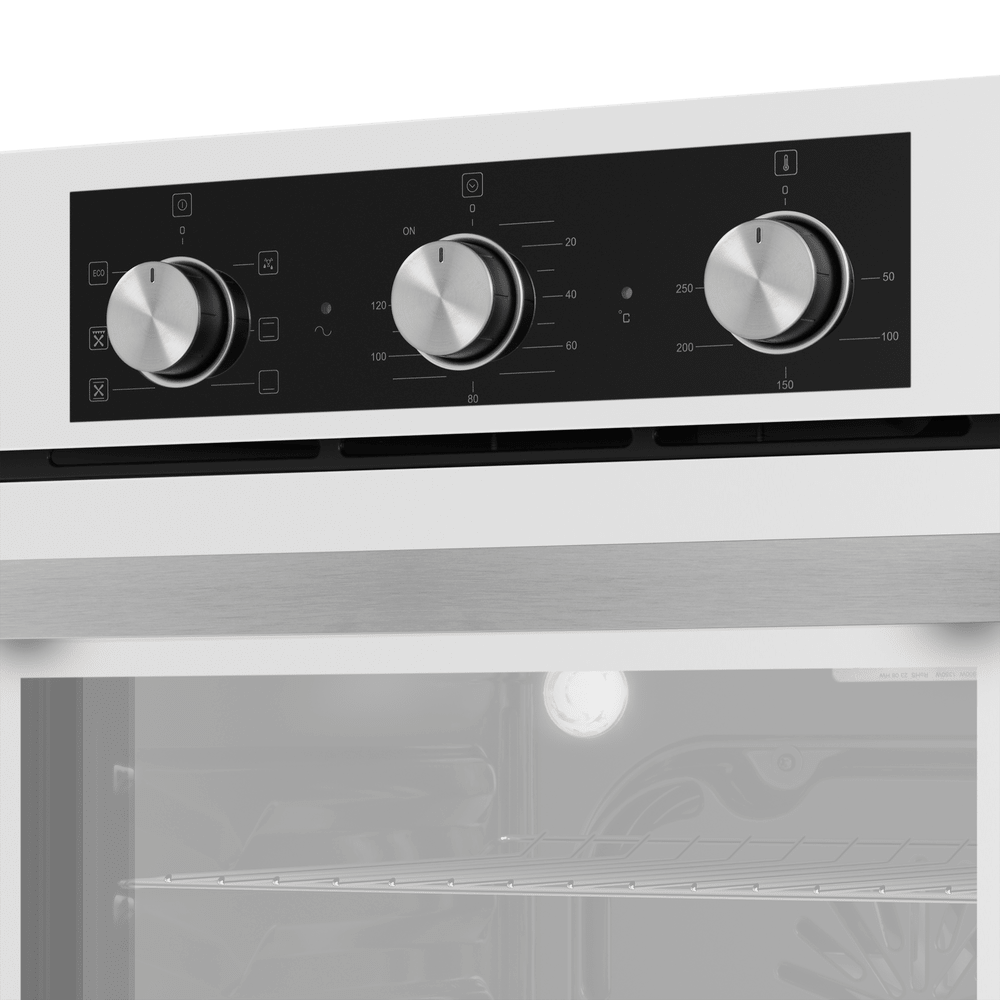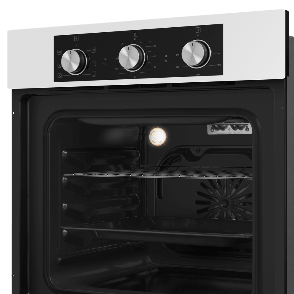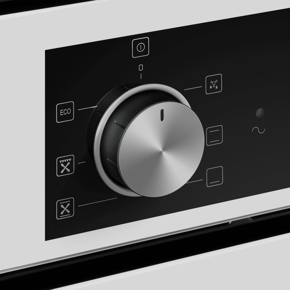 Особенности дизайна и внешней панели управления — также важный пункт при выборе духовки на кухню. В данной модели нужно обратить внимание на цвет — белый, Механическая панель управления позволяет быстро разобраться в настройке программ и не требует чрезмерных усилий.