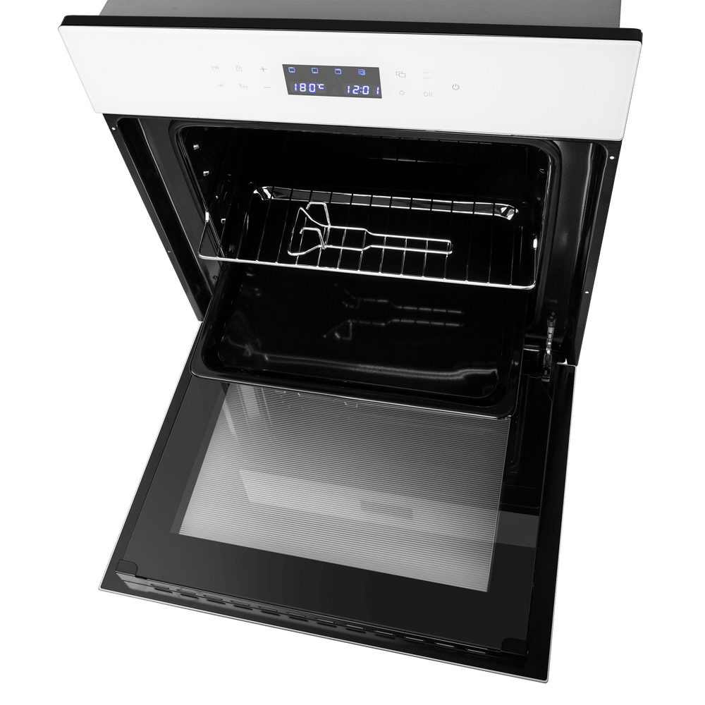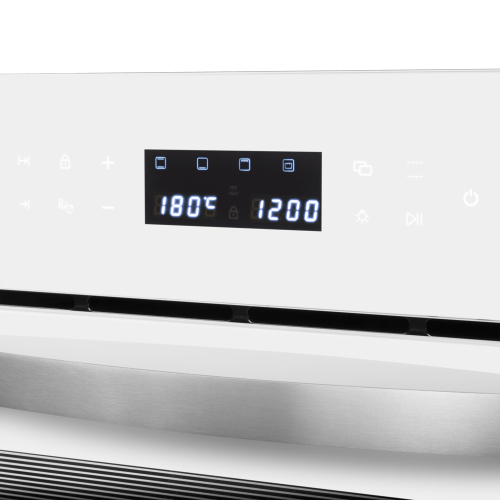 Особенности дизайна и внешней панели управления — также важный пункт при выборе духовки на кухню. В данной модели нужно обратить внимание на цвет — белый, охлаждение двери, чтобы поверхность и мебель вокруг не нагревались.