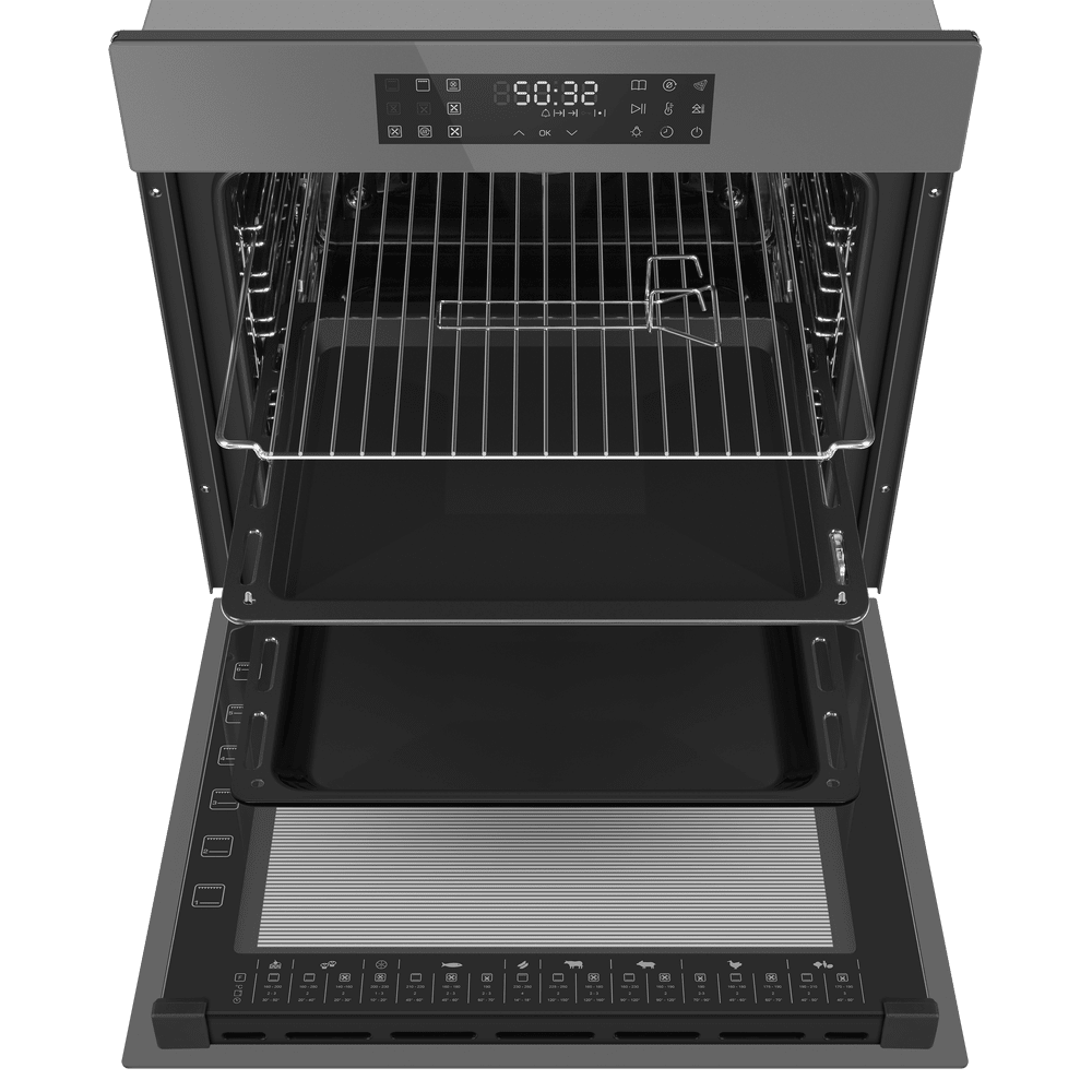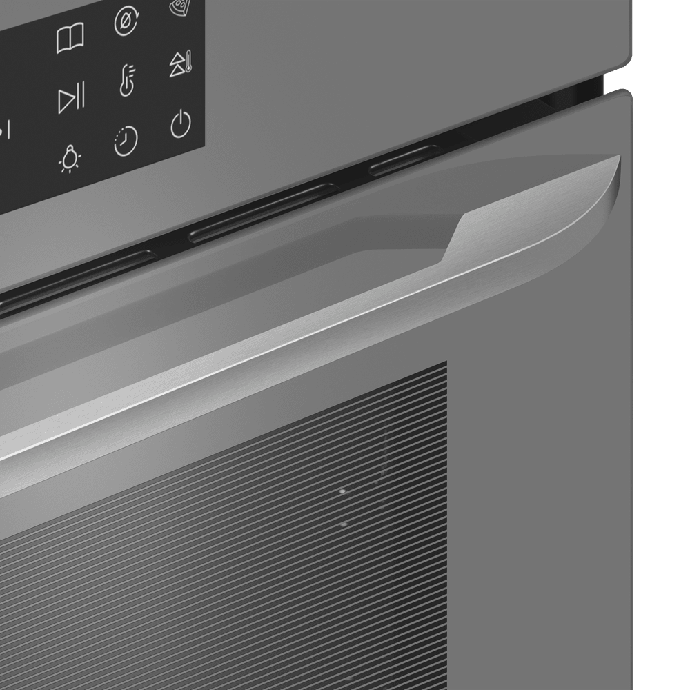 Особенности дизайна и внешней панели управления — также важный пункт при выборе духовки на кухню. В данной модели нужно обратить внимание на цвет — серый, охлаждение двери, чтобы поверхность и мебель вокруг не нагревались.