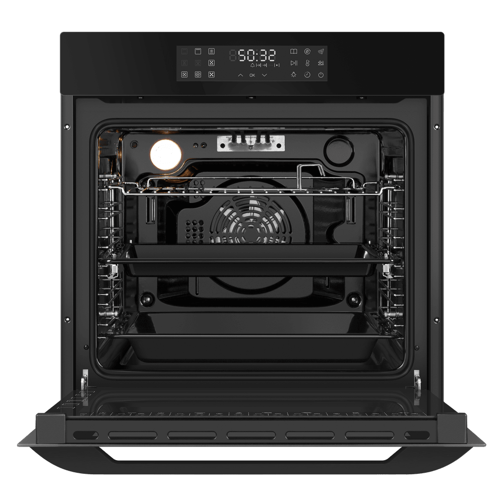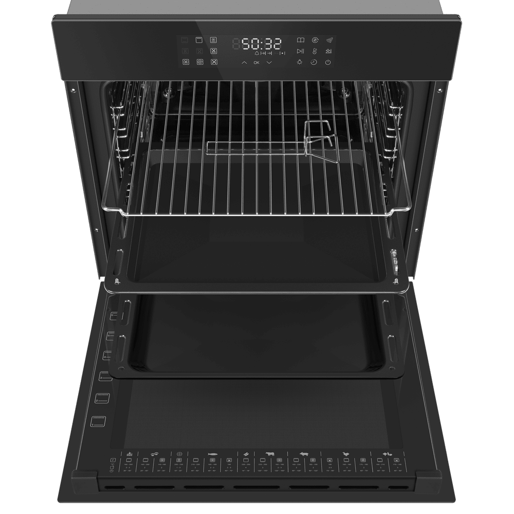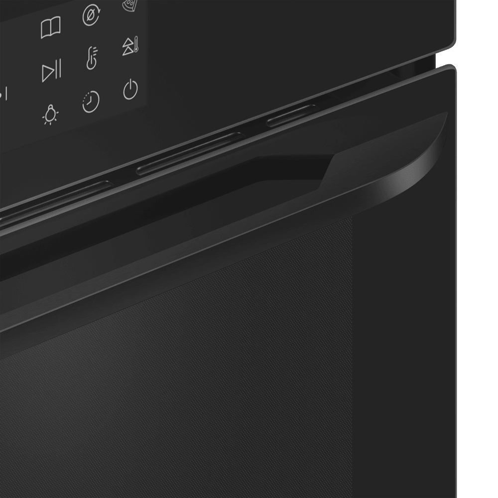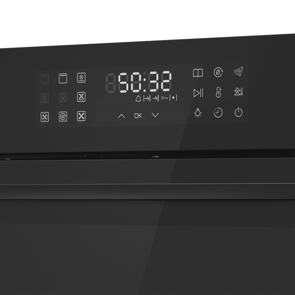 Строгий чёрный корпус и минималистичная передняя панель с сенсорными кнопками и дисплеем создают современный образ техники. Откидная дверца с трёхслойным остеклением и «холодной дверью» сохраняет безопасную температуру наружной поверхности, а чёрная фурнитура гармонично завершает впечатление. Стандартные габариты (ВхШхГ 59.5×59.5×57.5 см) и встраивание в нишу размерами 58.5×56.2×57 см делают прибор универсальным решением для большинства кухонь.