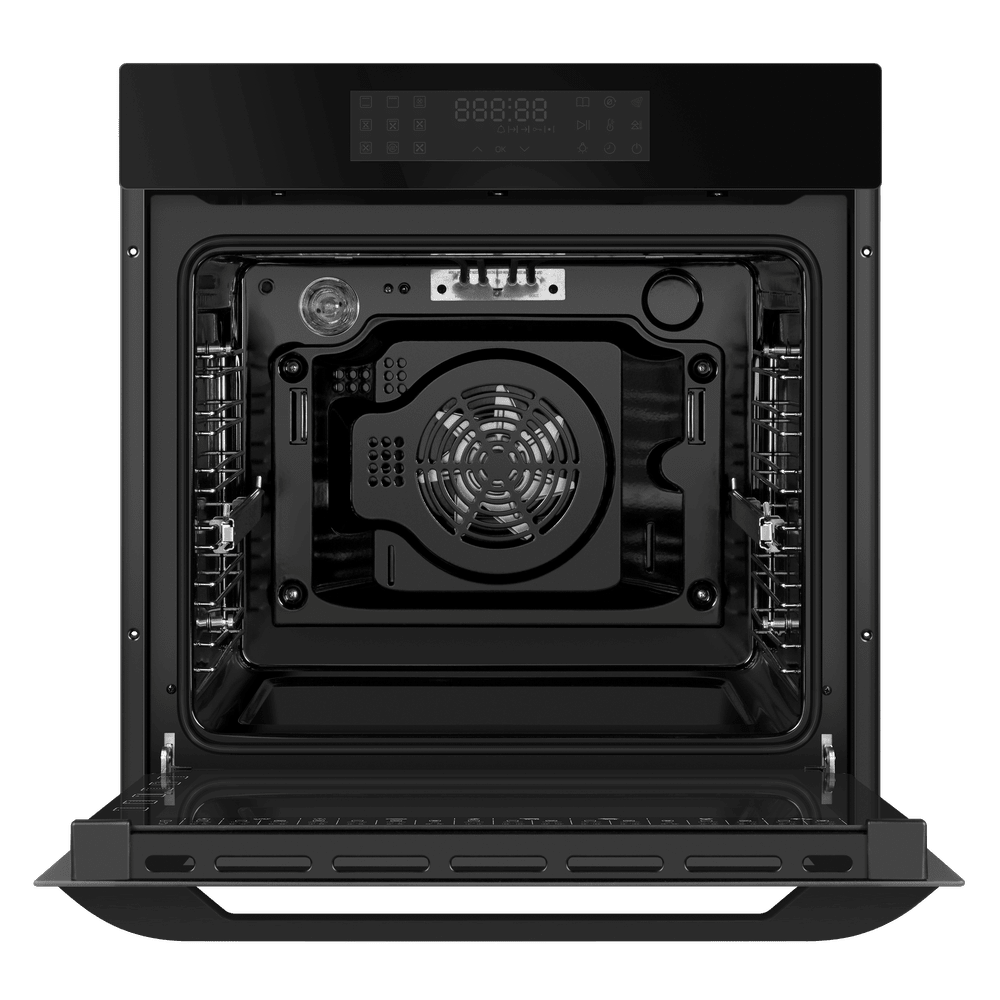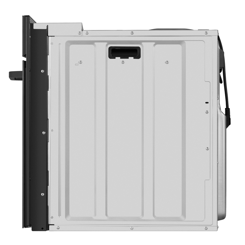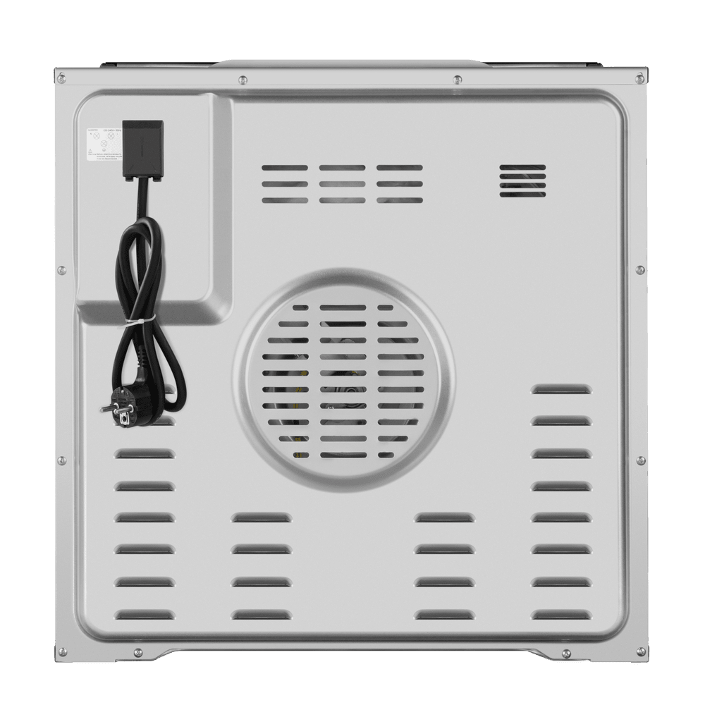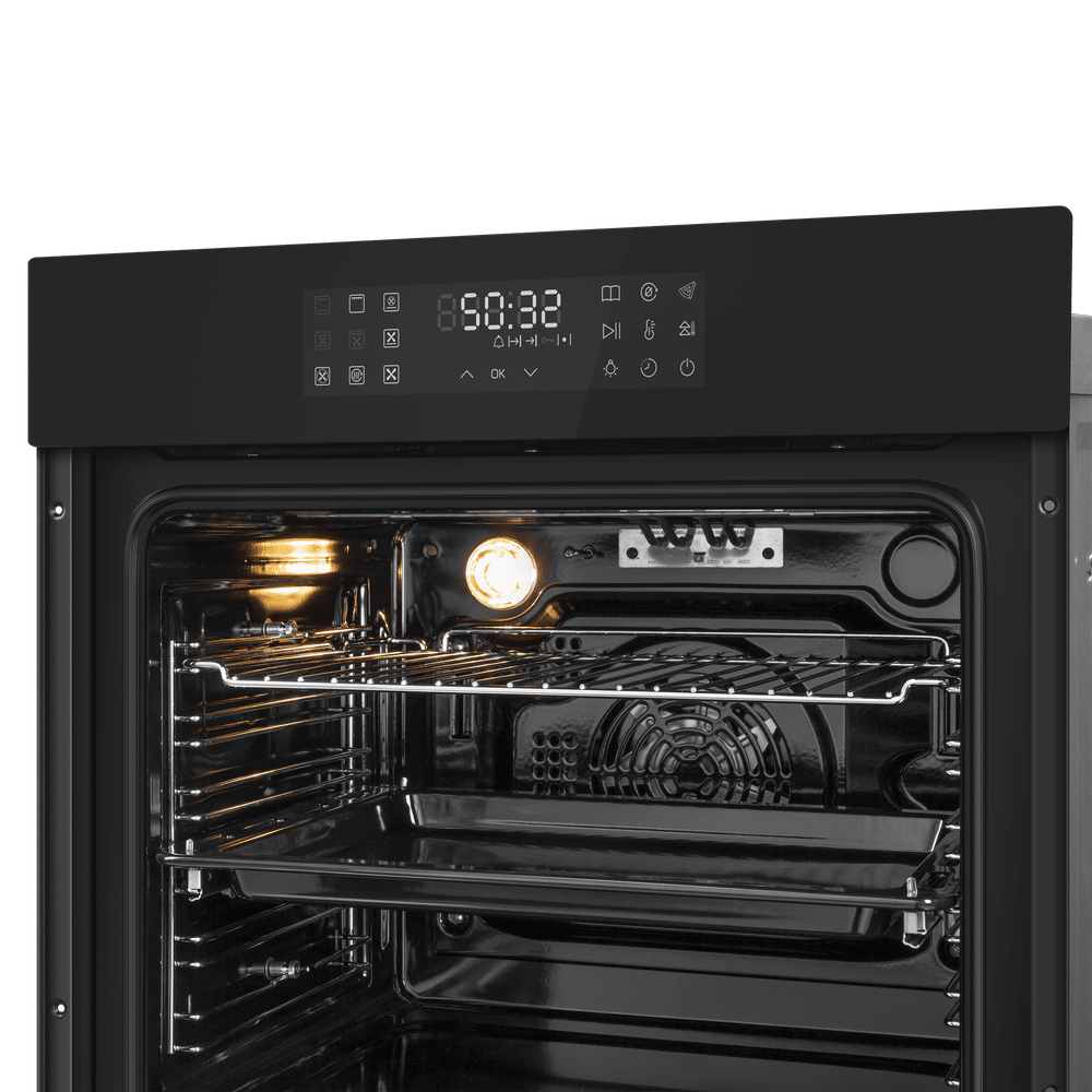 Строгий чёрный корпус и минималистичная передняя панель с сенсорными кнопками и дисплеем создают современный образ техники. Откидная дверца с трёхслойным остеклением и «холодной дверью» сохраняет безопасную температуру наружной поверхности, а чёрная фурнитура гармонично завершает впечатление. Стандартные габариты (ВхШхГ 59.5×59.5×57.5 см) и встраивание в нишу размерами 58.5×56.2×57 см делают прибор универсальным решением для большинства кухонь.