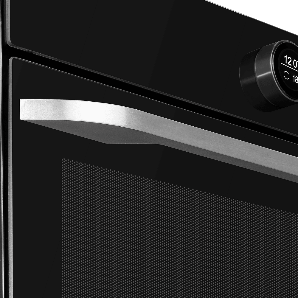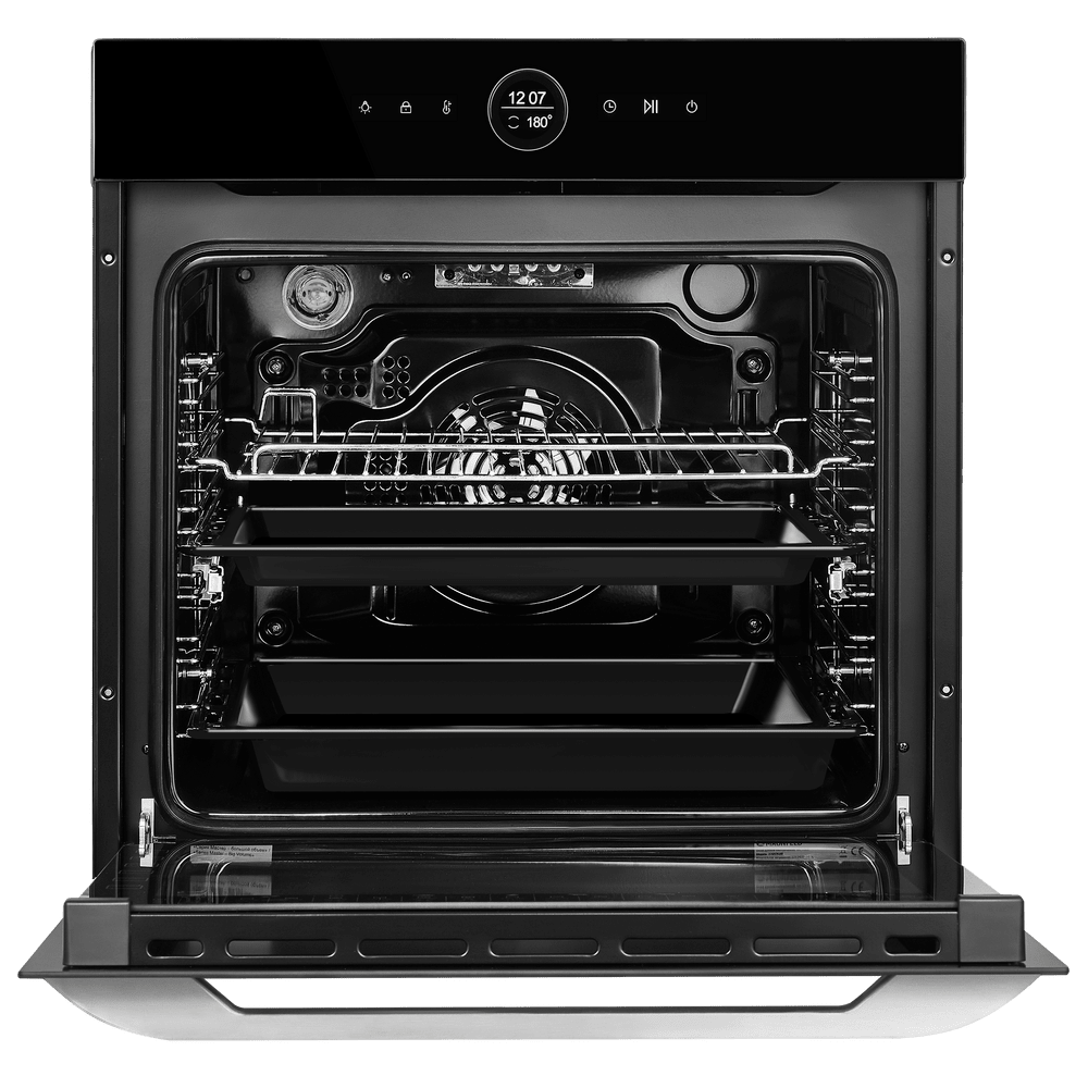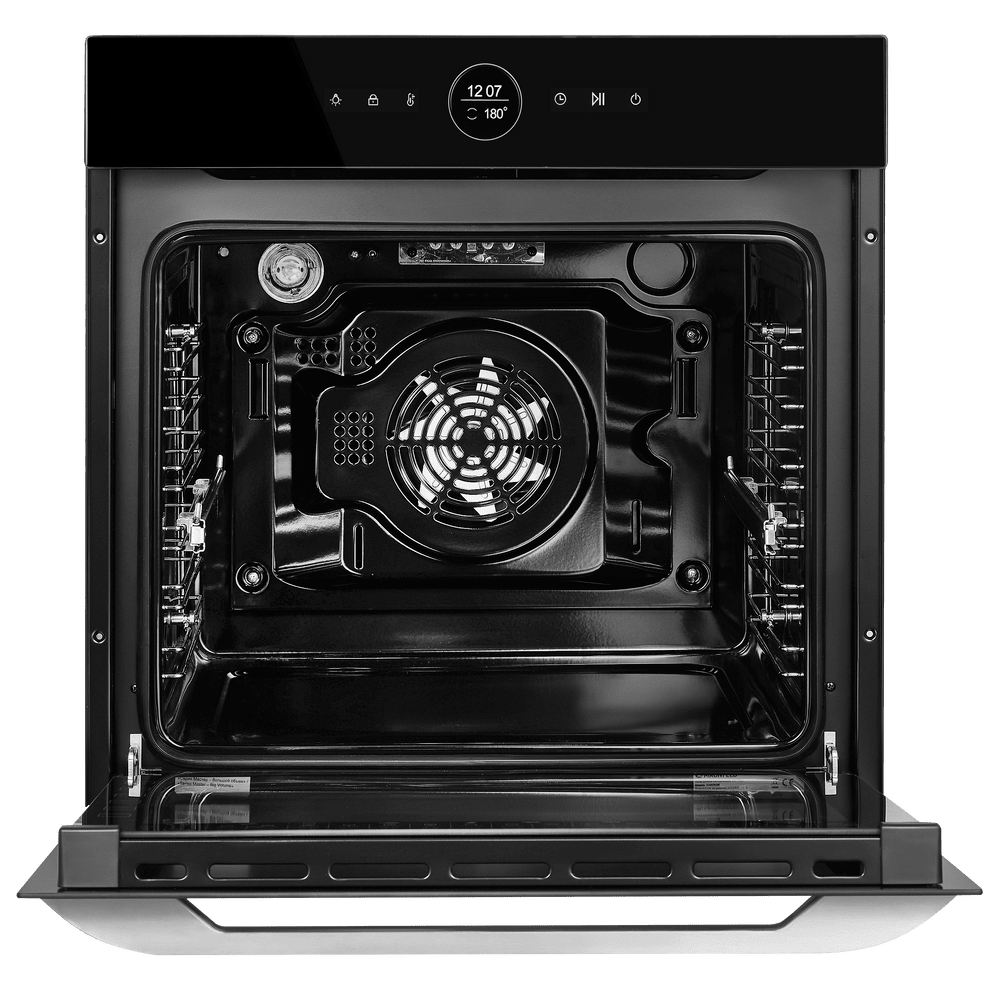 Особенности дизайна и внешней панели управления — также важный пункт при выборе духовки на кухню. В данной модели нужно обратить внимание на цвет — черный, охлаждение двери, чтобы поверхность и мебель вокруг не нагревались.