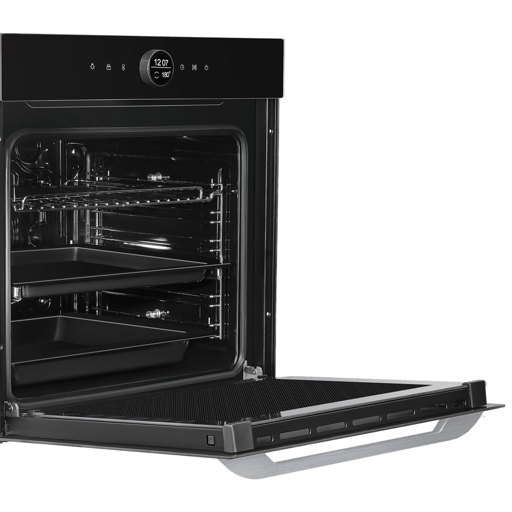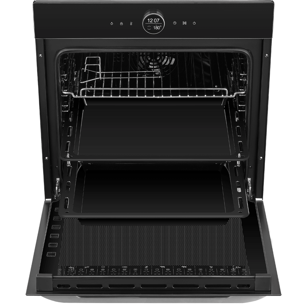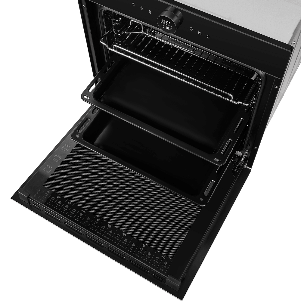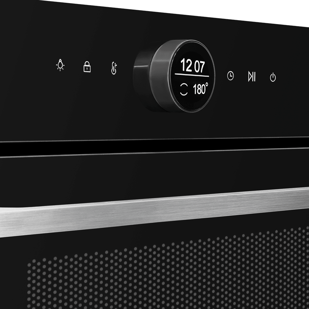 Особенности дизайна и внешней панели управления — также важный пункт при выборе духовки на кухню. В данной модели нужно обратить внимание на цвет — черный, охлаждение двери, чтобы поверхность и мебель вокруг не нагревались.