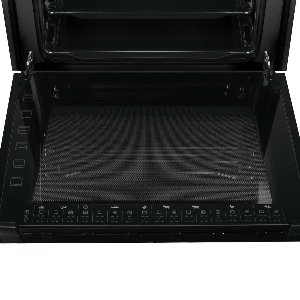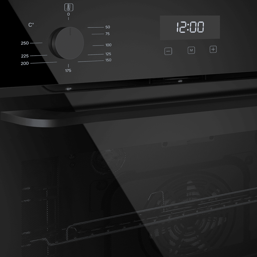 Особенности дизайна и внешней панели управления — также важный пункт при выборе духовки на кухню. В данной модели нужно обратить внимание на цвет — черный, охлаждение двери, чтобы поверхность и мебель вокруг не нагревались.