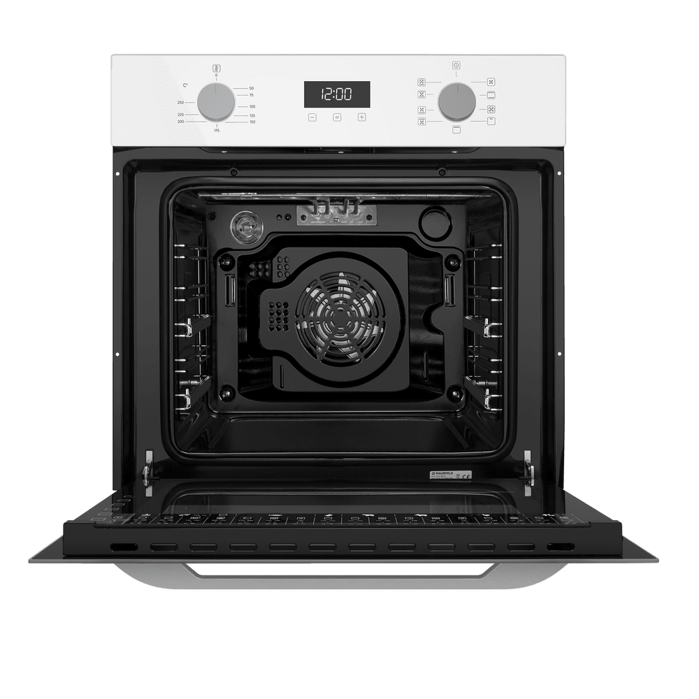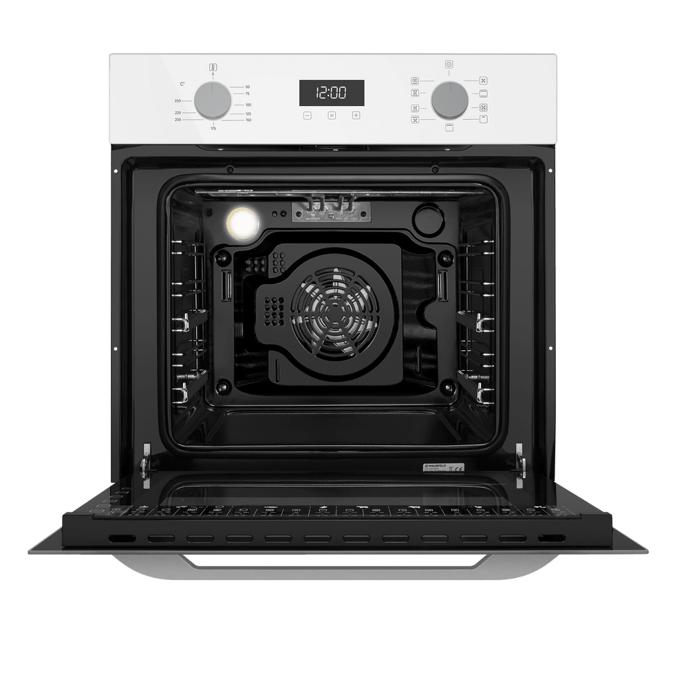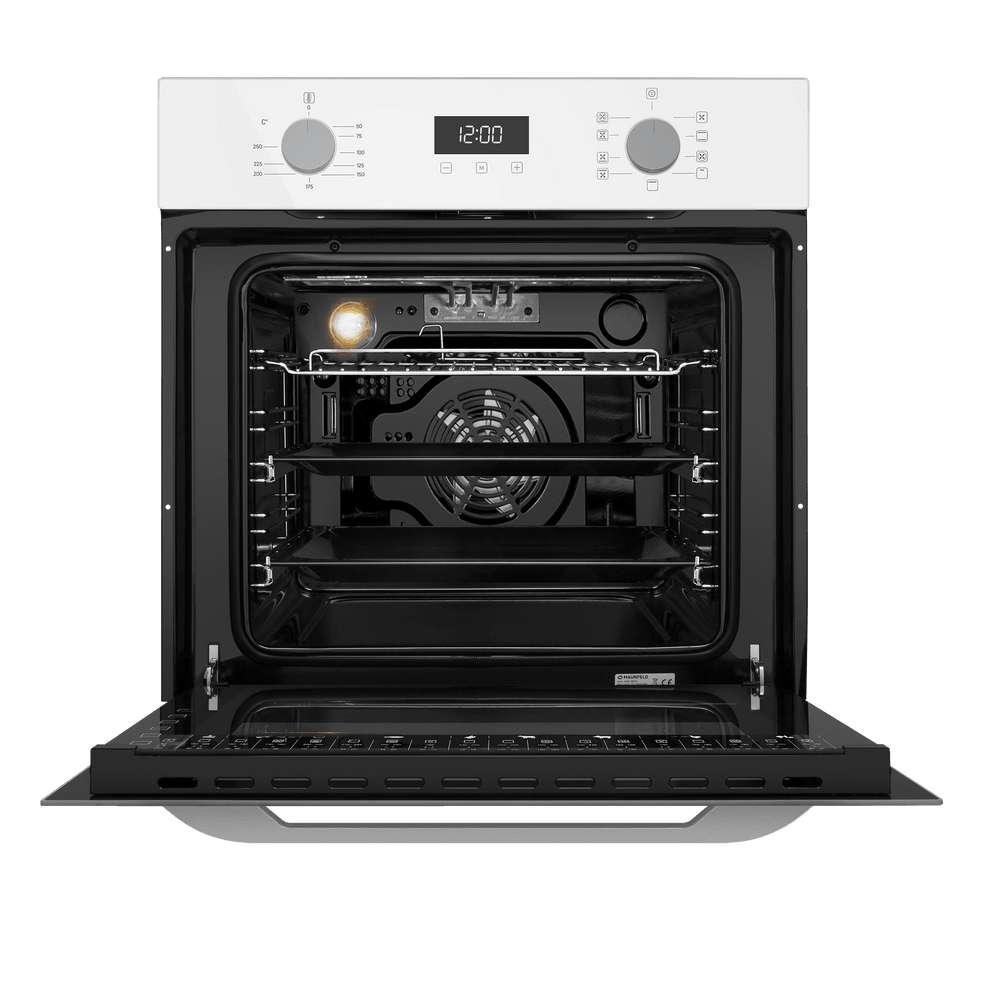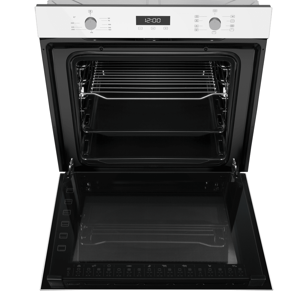 Особенности дизайна и внешней панели управления — также важный пункт при выборе духовки на кухню. В данной модели нужно обратить внимание на цвет — белый, охлаждение двери, чтобы поверхность и мебель вокруг не нагревались.