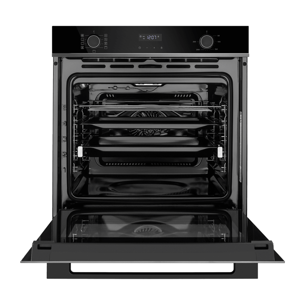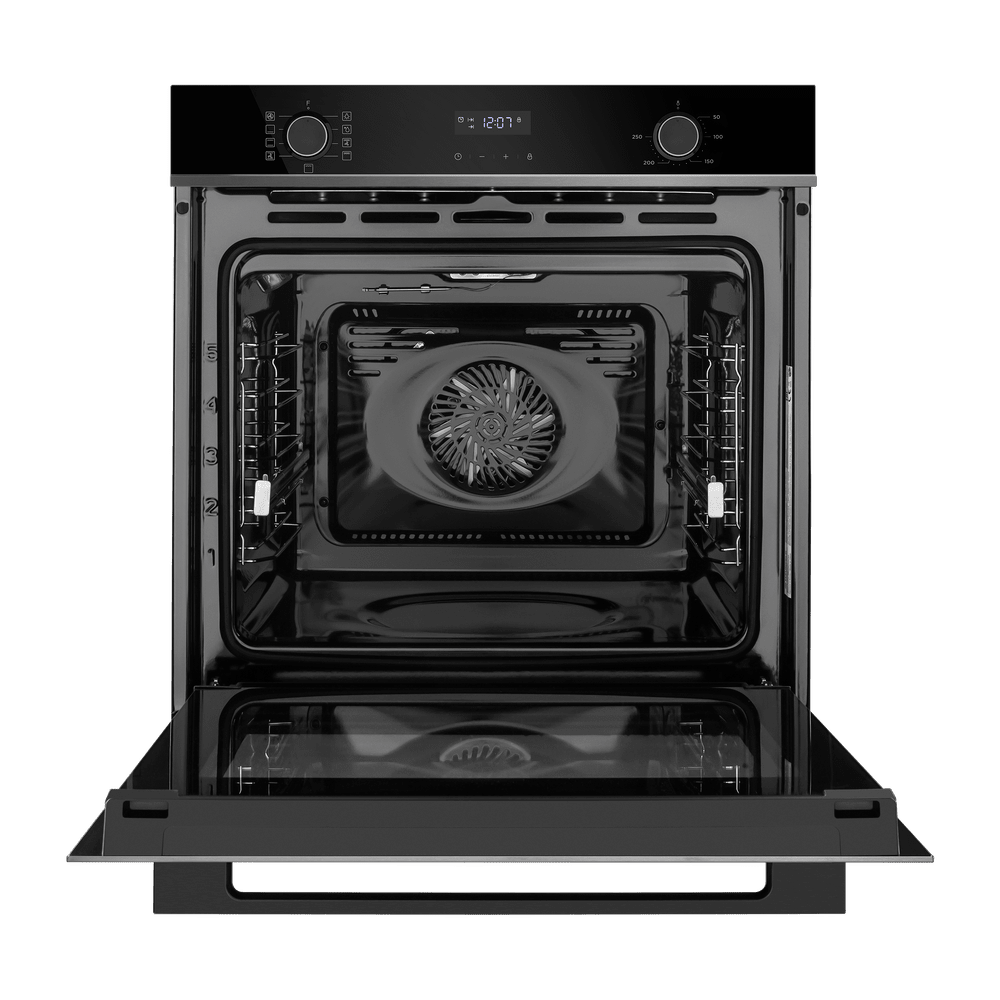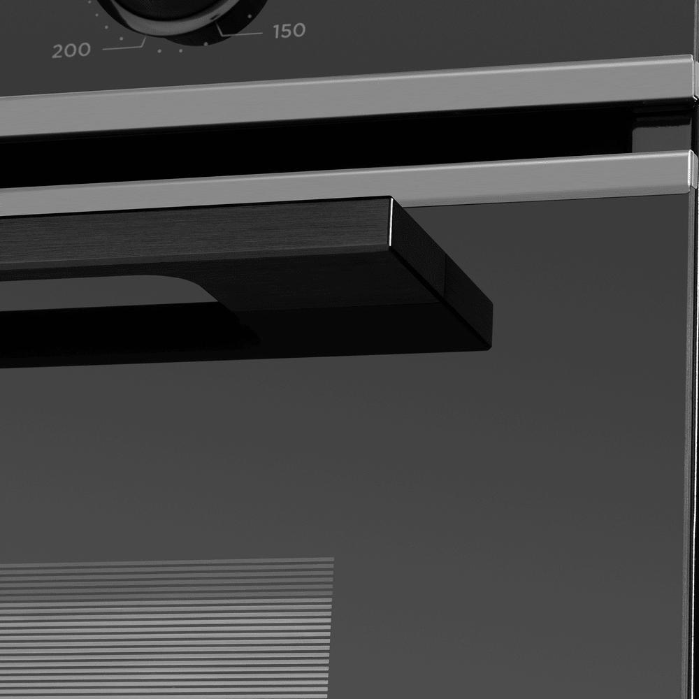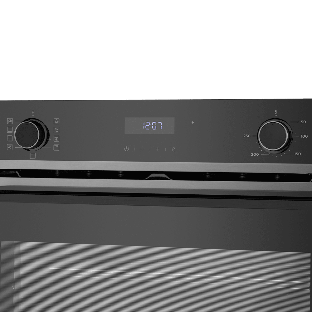 Особенности дизайна и внешней панели управления — также важный пункт при выборе духовки на кухню. В данной модели нужно обратить внимание на цвет — черный, охлаждение двери, чтобы поверхность и мебель вокруг не нагревались.
