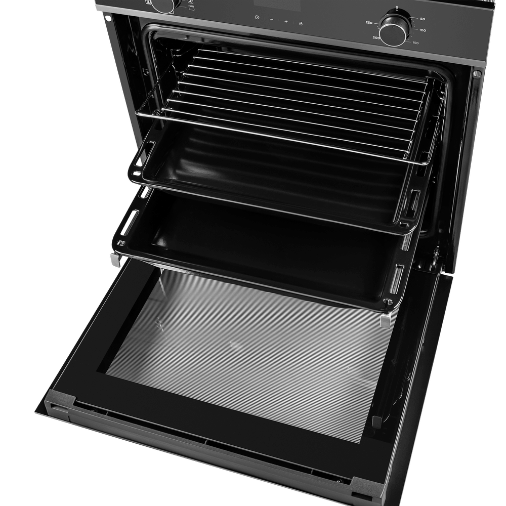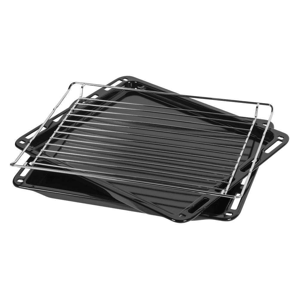 В стандартную комплектацию любого духового шкафа входят один или два противня — эмалированных или с антипригарным покрытием — и решетка. Единственный противень, как правило, имеет низкие бортики и предназначается для приготовления выпечки. Если духовка комплектуется двумя противнями, то второй отличается более высокими бортиками — его можно использовать для запекания мяса, птицы, овощных блюд. На решетке в духовке, не оснащенной грилем, обычно устанавливаются формы для запекания — стальные, керамические или стеклянные. В духовках премиум-класса количество противней может быть увеличено: к стандартному комплекту добавляются противни с перфорацией для мяса, специальные поддоны для сбора выделившегося сока.