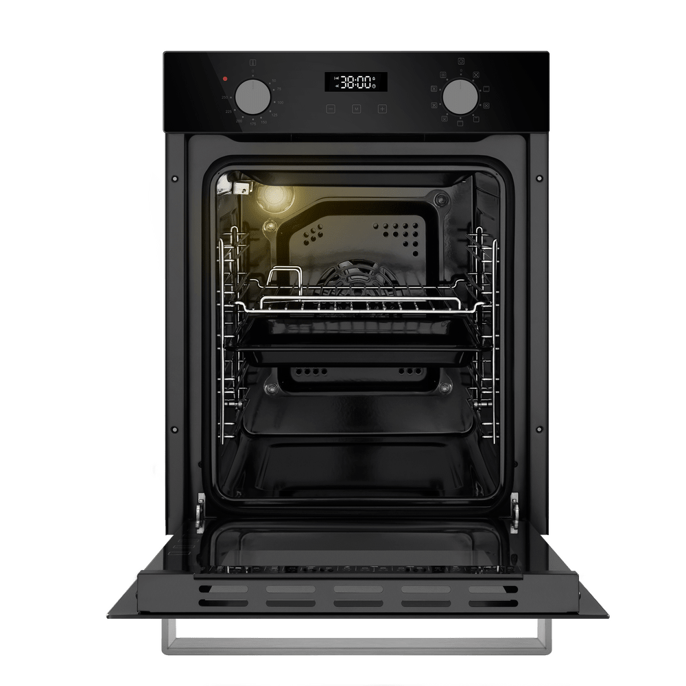 Как известно, стандартная ширина кухонной тумбы составляет около 60 см — поэтому за стандартную ширину встраиваемого духового шкафа принимают 59,5 см. Такие духовки имеют по 3–4 уровня приготовления, в них можно приготовить достаточно объемные блюда. Минимальное значение ширины духовки также соотносится с размерами тумбы для встраивания — оно составляет 44–45 см. Это хороший выбор для небольшой кухни, однако узкие духовые шкафы имеют свои недостатки — в частности, в них невозможно приготовить большой пирог или торт, запечь целый окорок, индейку или большую рыбу.