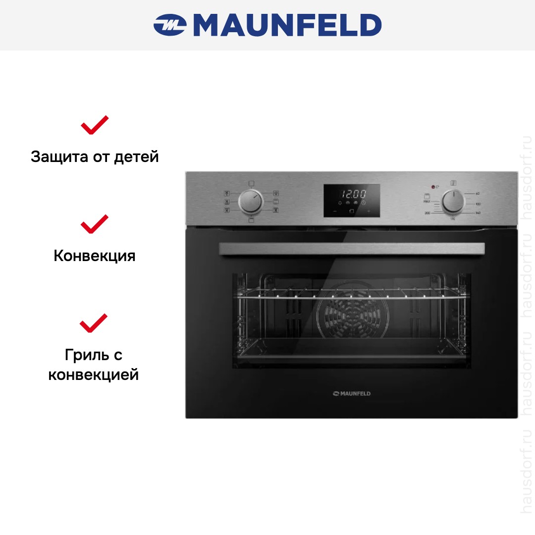 Количество режимов работы в духовом шкафу Маунфилд: 6. В число доступных программ входят: классический нагрев, конвекция, гриль для создания хрустящей корочки, и другие. Тип гриля в этой модели — электрический.