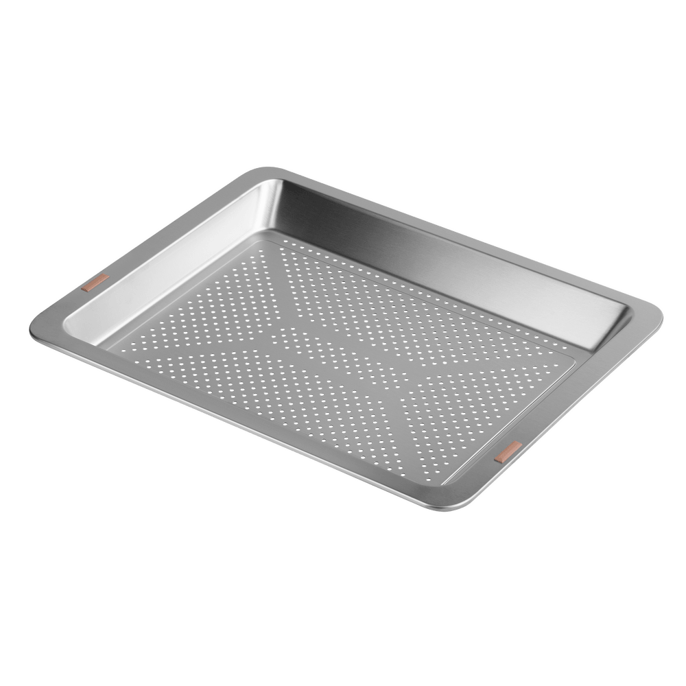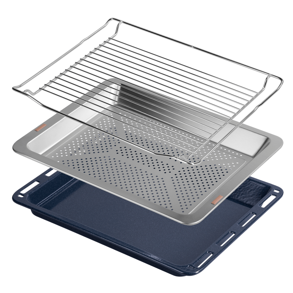В стандартную комплектацию любого духового шкафа входят один или два противня — эмалированных или с антипригарным покрытием — и решетка. Единственный противень, как правило, имеет низкие бортики и предназначается для приготовления выпечки. Если духовка комплектуется двумя противнями, то второй отличается более высокими бортиками — его можно использовать для запекания мяса, птицы, овощных блюд. На решетке в духовке, не оснащенной грилем, обычно устанавливаются формы для запекания — стальные, керамические или стеклянные. В духовках премиум-класса количество противней может быть увеличено: к стандартному комплекту добавляются противни с перфорацией для мяса, специальные поддоны для сбора выделившегося сока.
