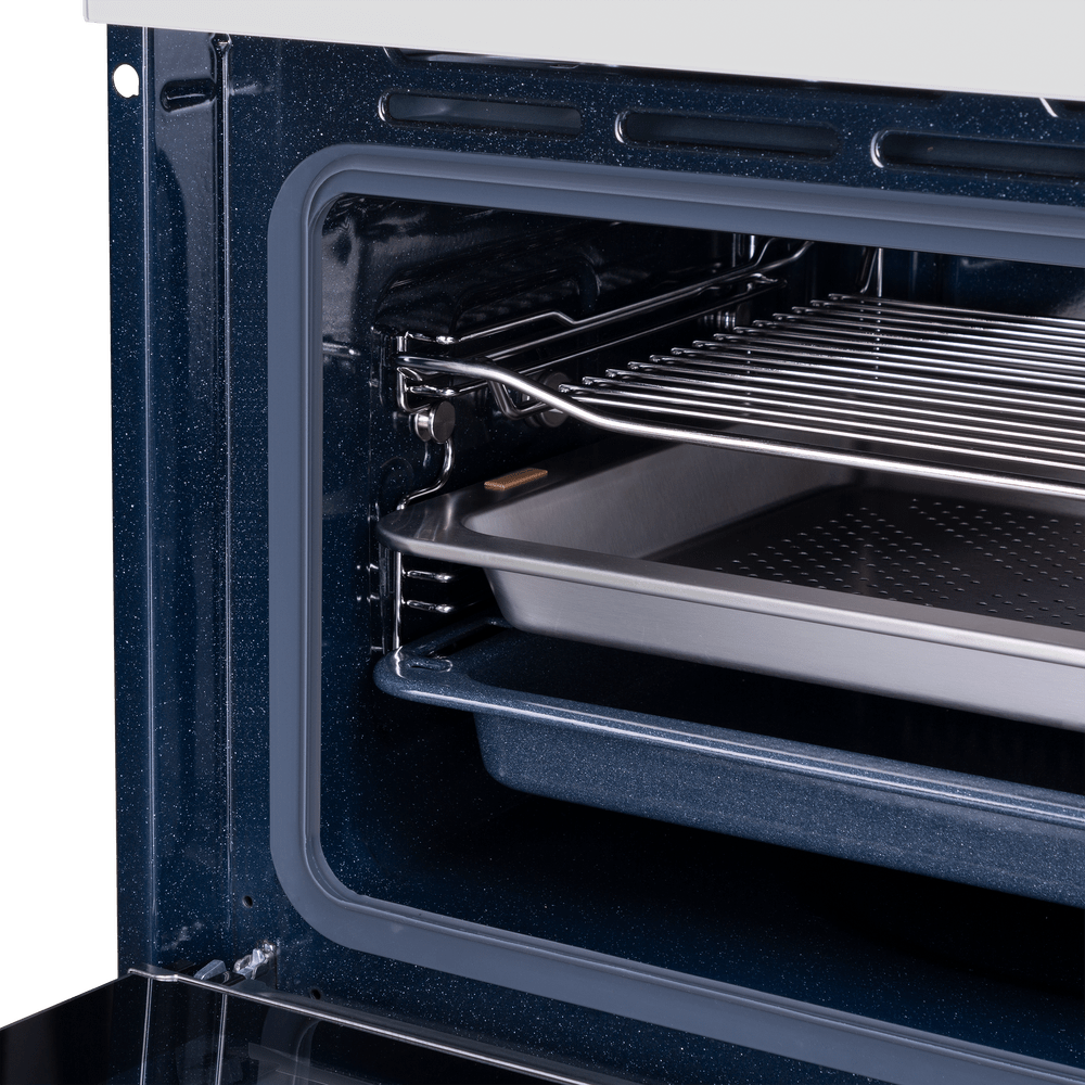 В стандартную комплектацию любого духового шкафа входят один или два противня — эмалированных или с антипригарным покрытием — и решетка. Единственный противень, как правило, имеет низкие бортики и предназначается для приготовления выпечки. Если духовка комплектуется двумя противнями, то второй отличается более высокими бортиками — его можно использовать для запекания мяса, птицы, овощных блюд. На решетке в духовке, не оснащенной грилем, обычно устанавливаются формы для запекания — стальные, керамические или стеклянные. В духовках премиум-класса количество противней может быть увеличено: к стандартному комплекту добавляются противни с перфорацией для мяса, специальные поддоны для сбора выделившегося сока.