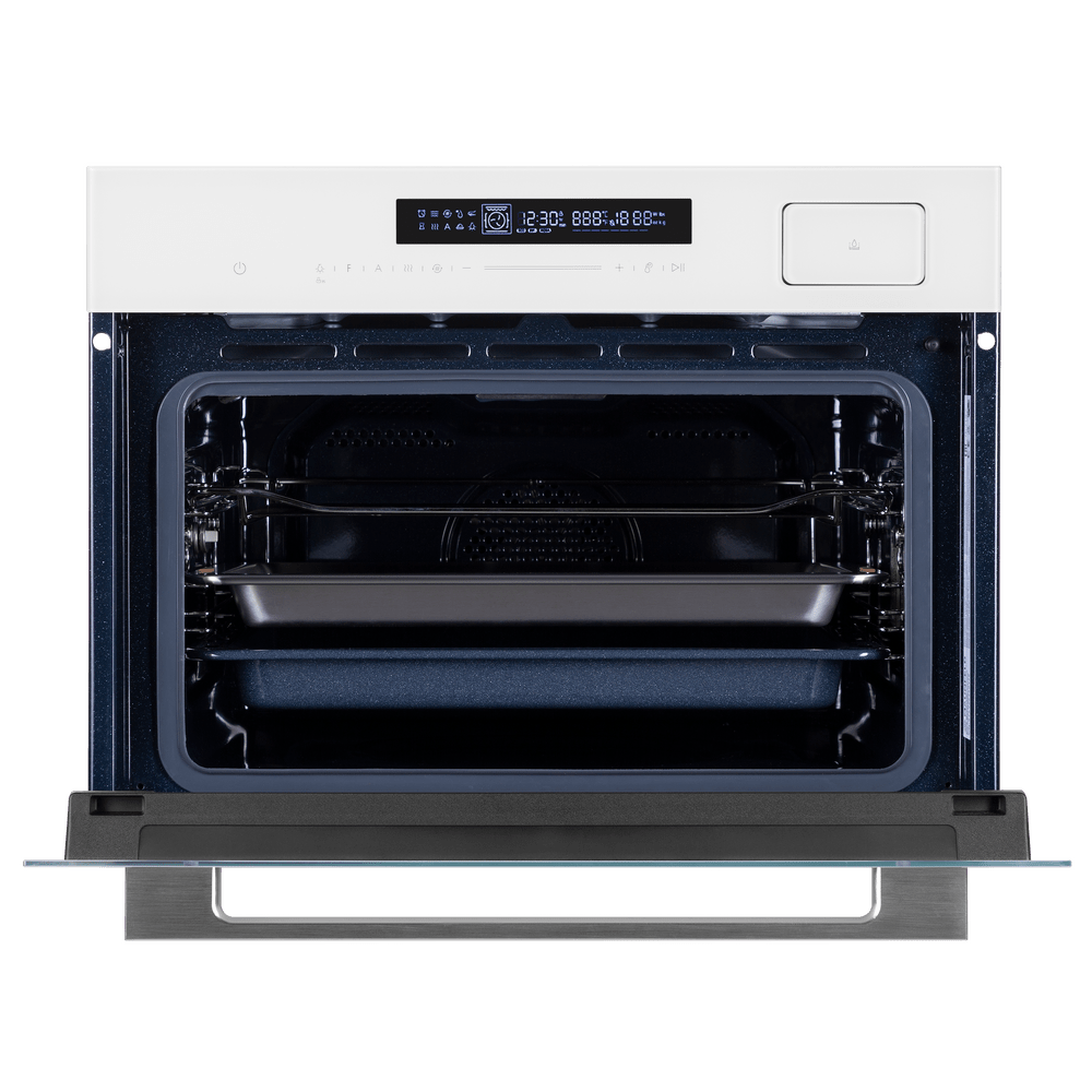 Белый фасад духовки — классический вариант: именно в белом цвете эти приборы производились многие десятилетия. Он стильно выглядит, менее маркий, более удобный в уходе: подойдет как для классических, так и для современных интерьеров. Кроме того, белая духовка будет оптимальным вариантом для небольшой кухни, так как этот цвет зрительно расширяет пространство.