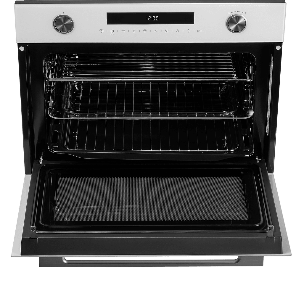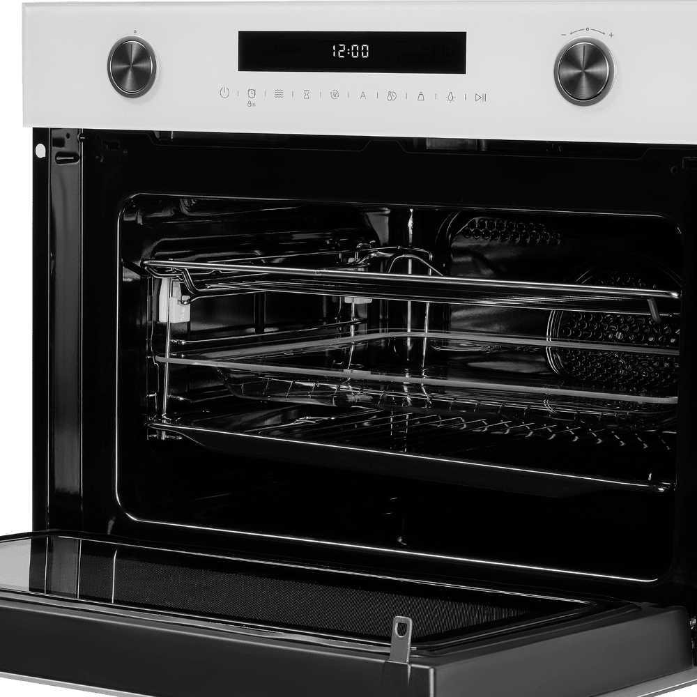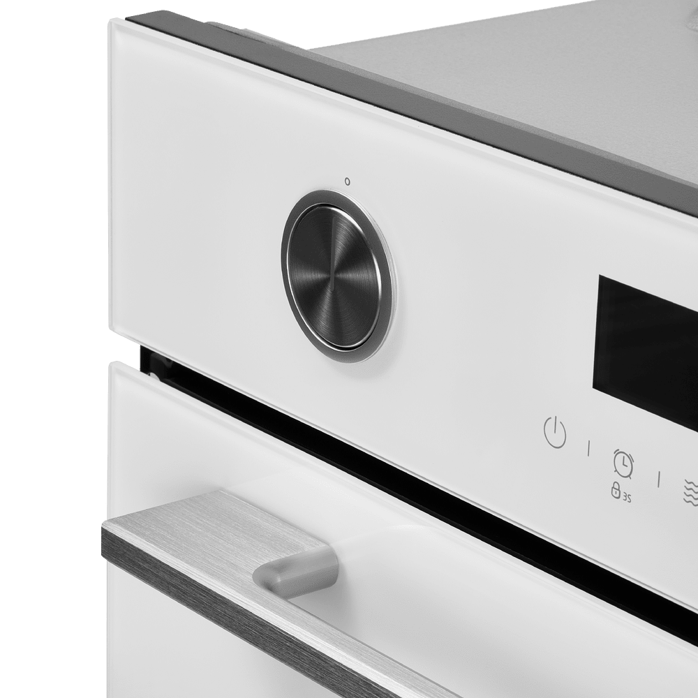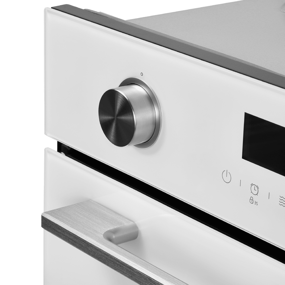 Особенности дизайна и внешней панели управления — также важный пункт при выборе духовки на кухню. В данной модели нужно обратить внимание на цвет — белый,