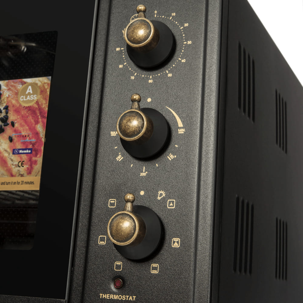 Особенности дизайна и внешней панели управления — также важный пункт при выборе духовки на кухню. В данной модели нужно обратить внимание на цвет — черный, Механическая панель управления позволяет быстро разобраться в настройке программ и не требует чрезмерных усилий.