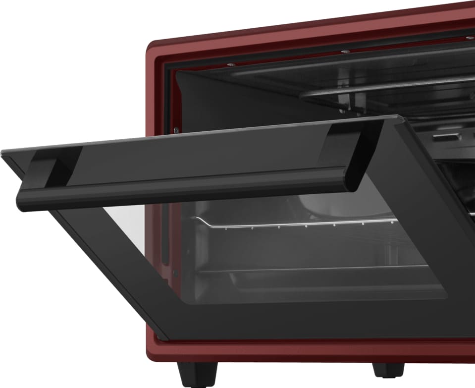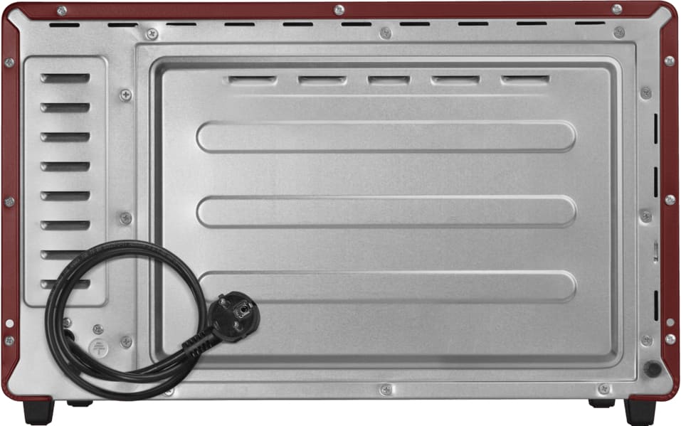 Особенности дизайна и внешней панели управления — также важный пункт при выборе духовки на кухню. В данной модели нужно обратить внимание на цвет — красный, Механическая панель управления позволяет быстро разобраться в настройке программ и не требует чрезмерных усилий.