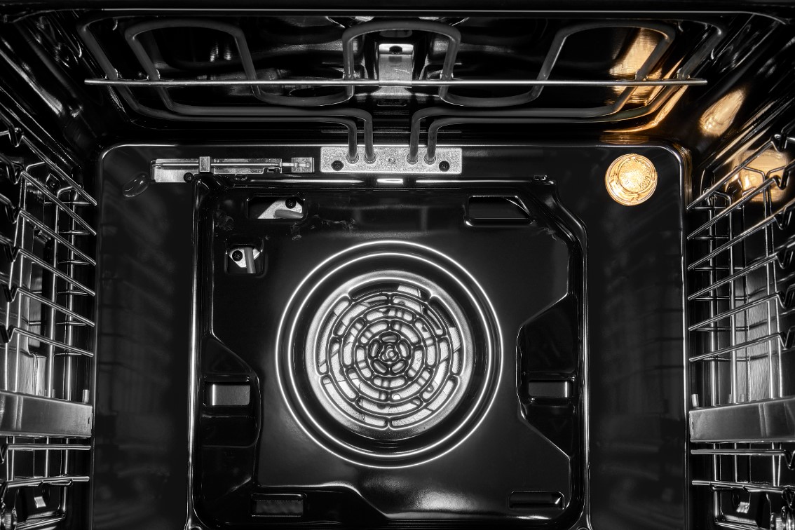 Нижний нагревательный элемент способствует быстрому повышению температуры воздуха в камере. В то же время начинает работать кольцевой нагревательный элемент на задней стенке камеры: расположенный внутри его контура вентилятор равномерно распространяет оба потока горячего воздуха по всему объему камеры. Таким образом, при размещении противня на третьем или втором уровне нижняя сторона блюда будет поджариваться за счет действия ТЭНа, а верхняя — запекаться под действием горячего воздуха, так что начинка всегда будет оставаться мягкой и сочной.