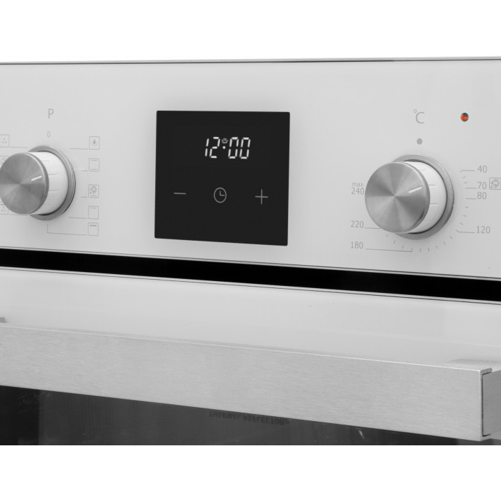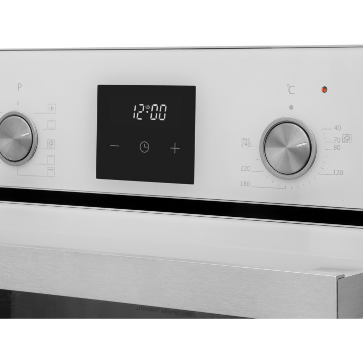 Особенности дизайна и внешней панели управления — также важный пункт при выборе духовки на кухню. В данной модели нужно обратить внимание на цвет — белый,