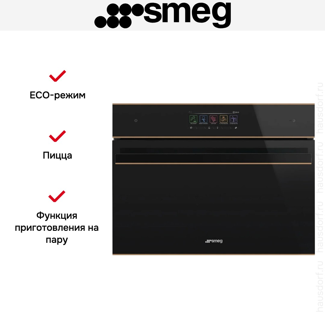 Количество режимов работы в духовом шкафу Смег: 26. В число доступных программ входят: классический нагрев, нижний нагрев, конвекция, приготовление с помощью микроволн, дополнительное использование пара, гриль для создания хрустящей корочки, пицца, и другие. Помимо основных программ воспользуйтесь специальными возможностями этого прибора: режимом Sous-Vide для приготовления нежных, диетических блюд в вакуумной упаковке; вентилятором, совмещенным с грилем; и другими.