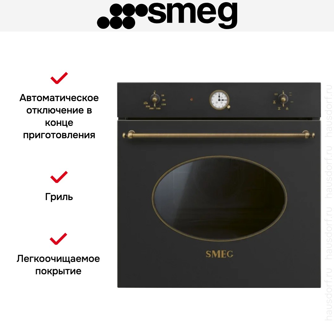 Количество режимов работы в духовом шкафу Смег: 6. В число доступных программ входят: классический нагрев, конвекция, гриль для создания хрустящей корочки, и другие.