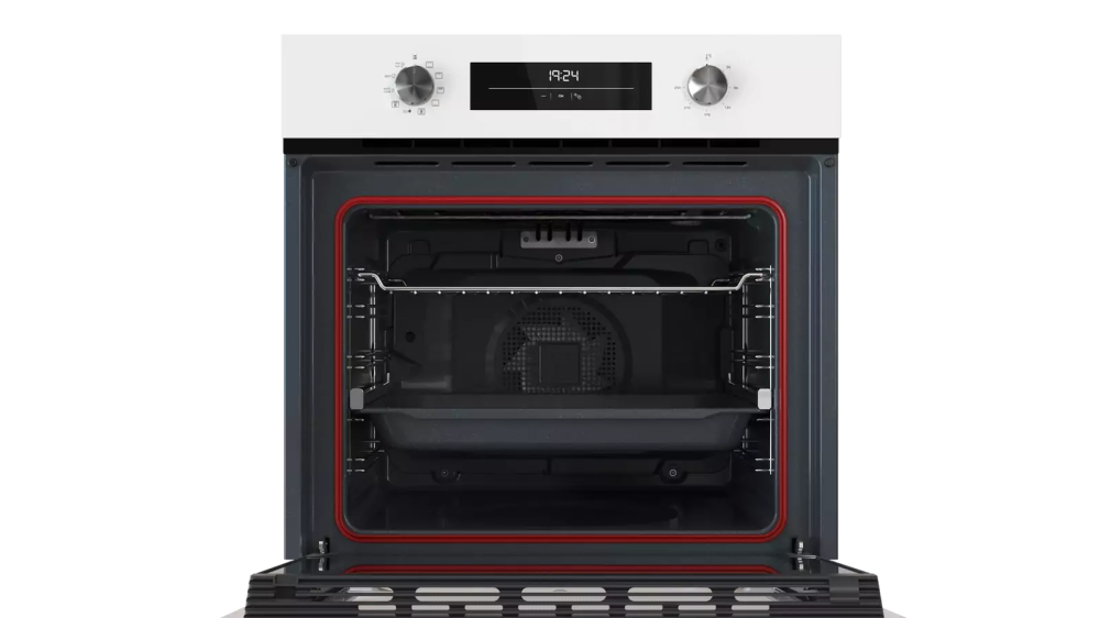 Особенности дизайна и внешней панели управления — также важный пункт при выборе духовки на кухню. В данной модели нужно обратить внимание на цвет — белый,
