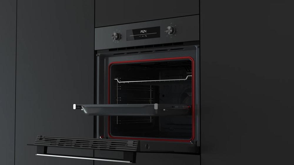 Особенности дизайна и внешней панели управления — также важный пункт при выборе духовки на кухню. В данной модели нужно обратить внимание на цвет — черный, специальное покрытие, предотвращающее появление заметных отпечатков пальцев,